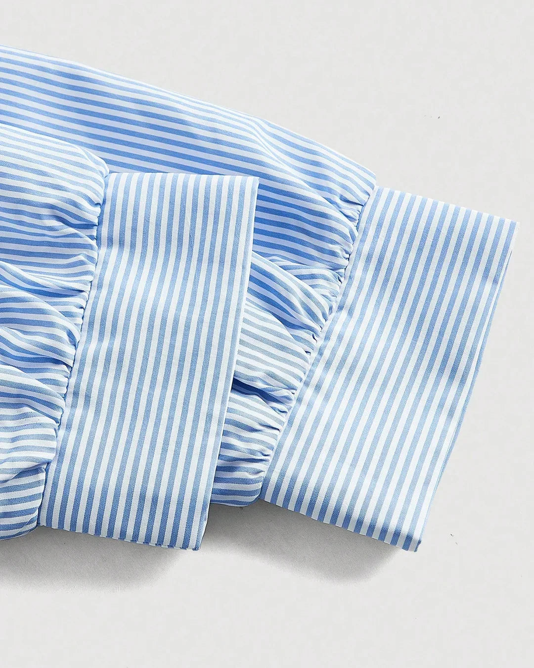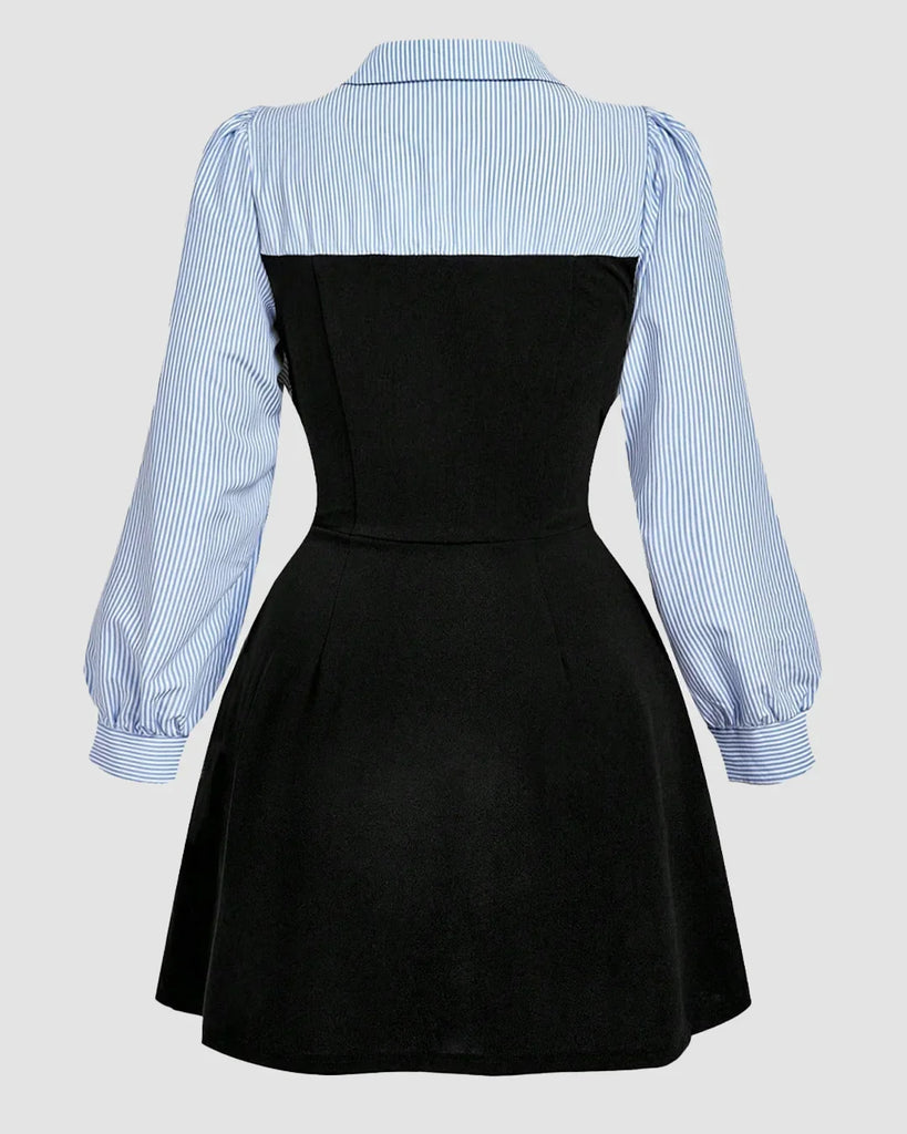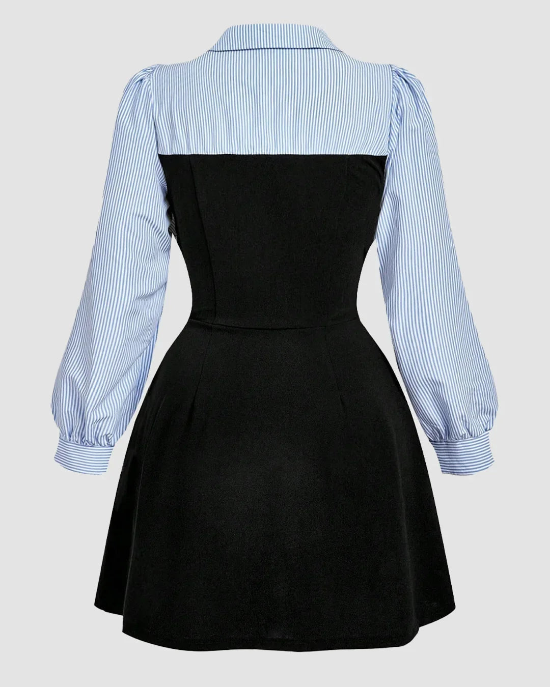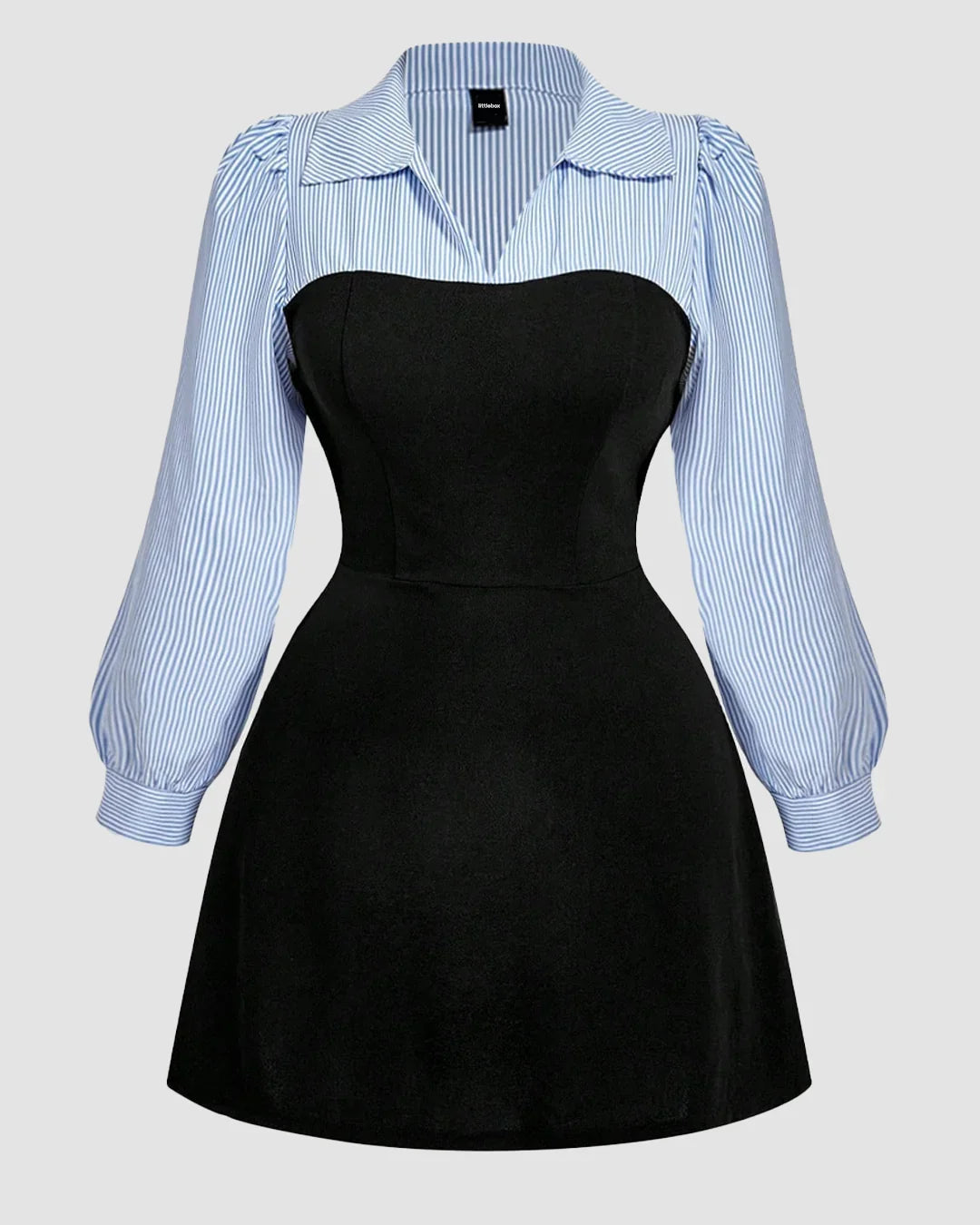 This A Line Mini Dress mixes contrast panels with a clean, structured shape that feels fresh and stylish. The black bodice creates a neat fitted look, while the striped shirt sleeves add a soft, casual twist. The flared mini length keeps it playful and easy to move in, making it a standout pick for everyday wear. The mix of fabrics gives it a smooth finish with a light, airy touch through the sleeves.