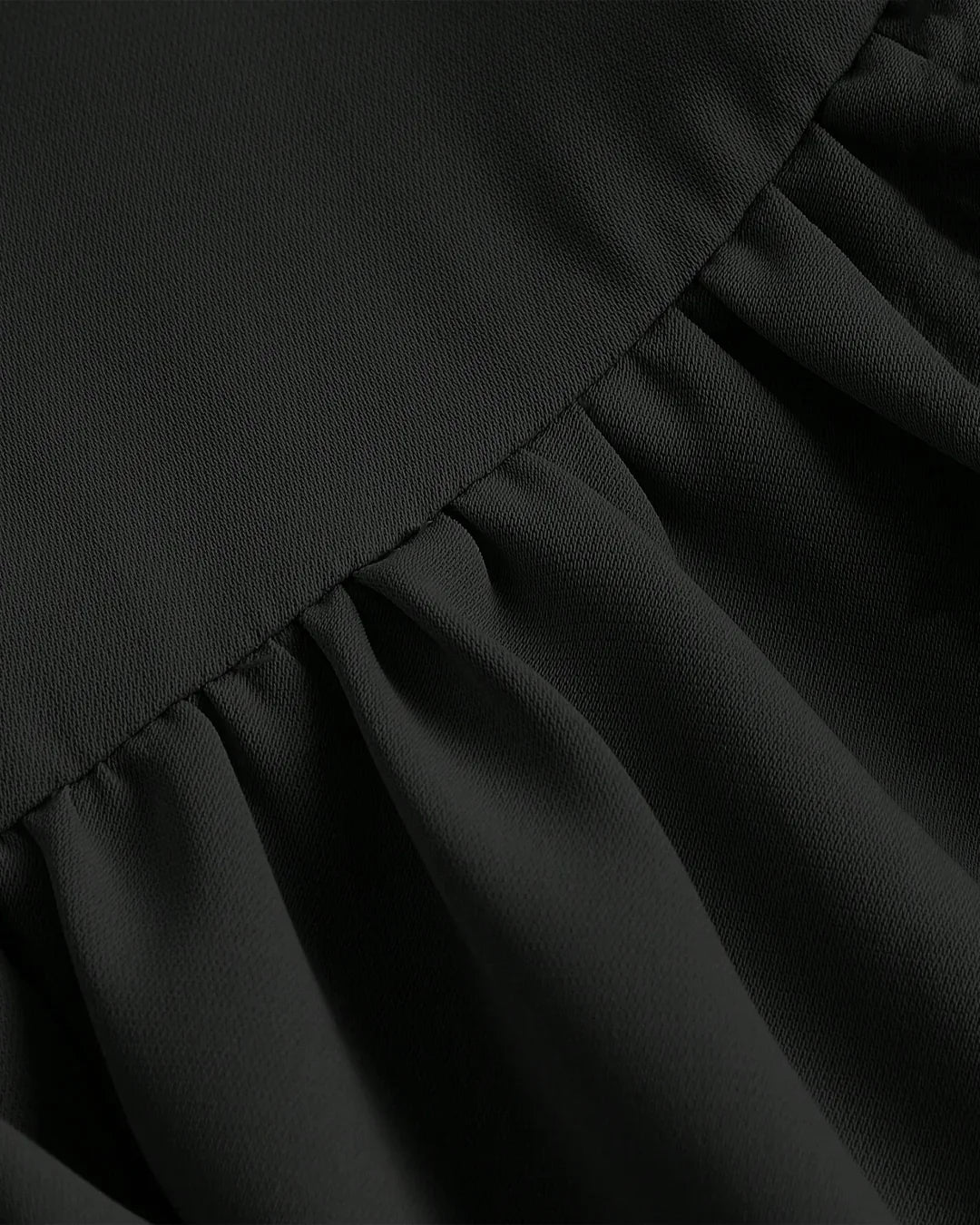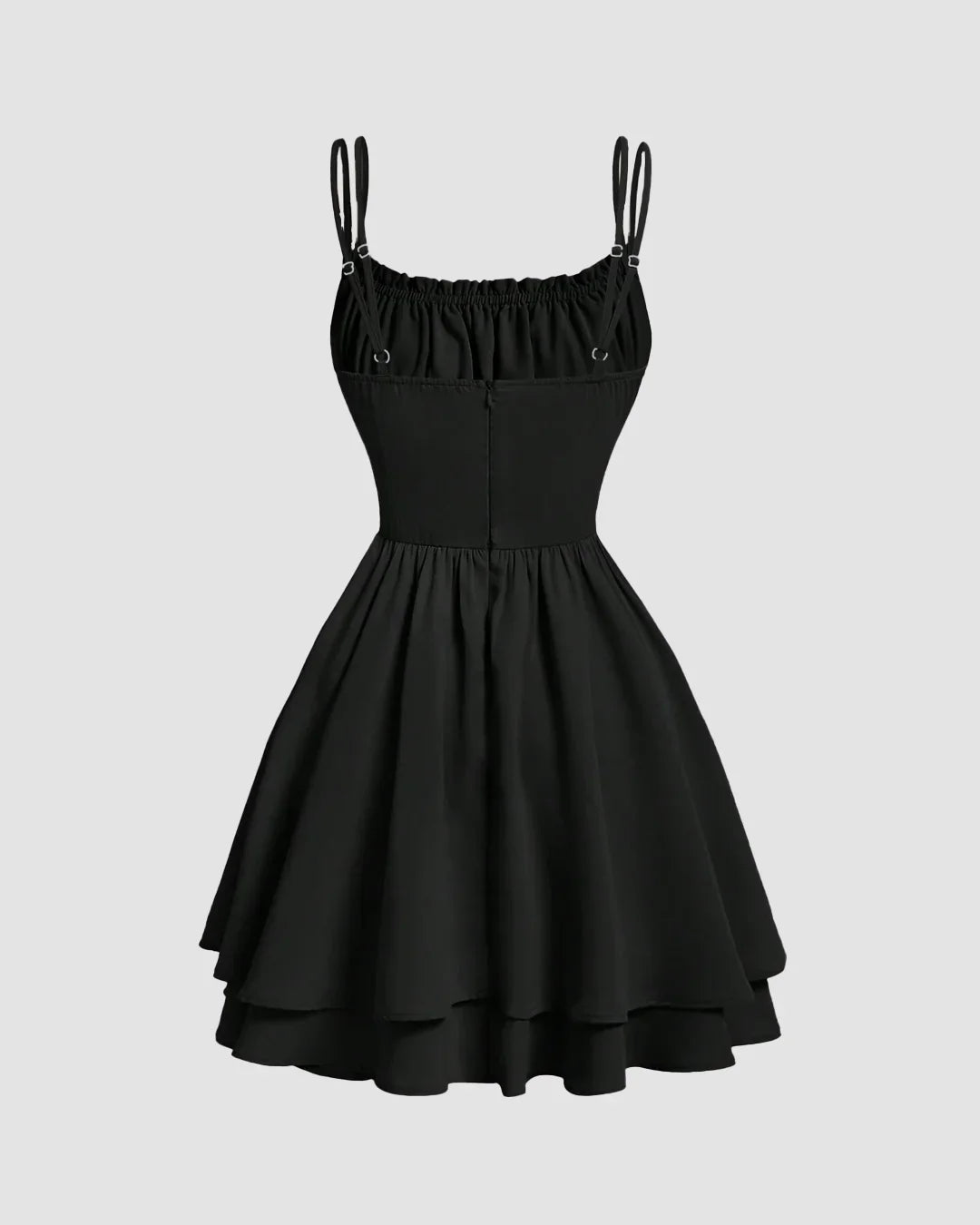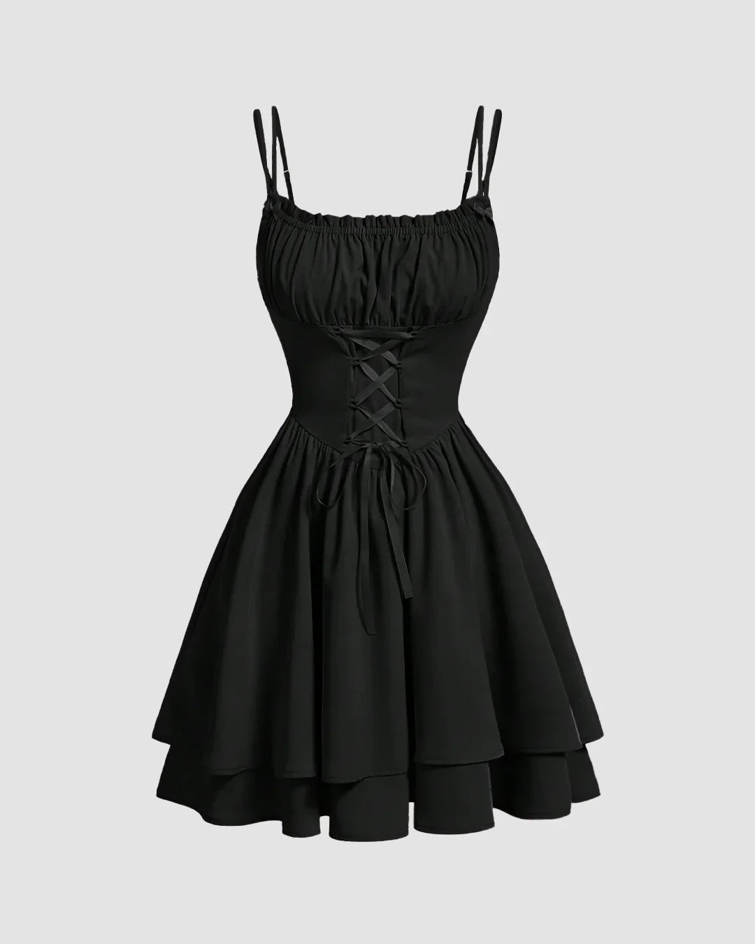 The Black Tiered black mini dress brings major fairytale energy with a fitted lace-up waist and dreamy flared layers. The double spaghetti straps and ruched neckline create a flattering, cinched shape that’s effortlessly cute and structured.