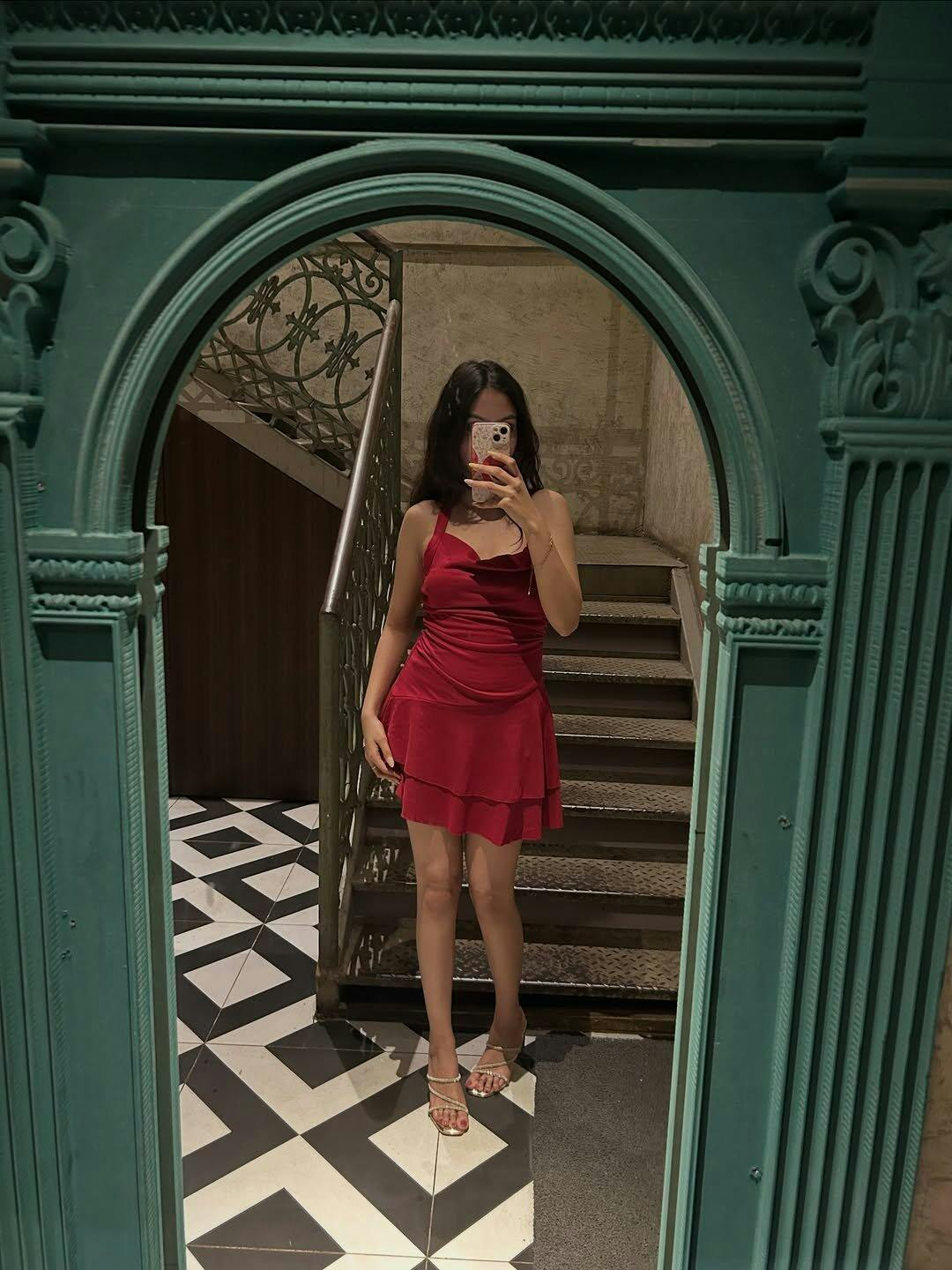 Flirty meets polished in this curve-hugging halter neck mini dress. Designed with a sweetheart-style halter neckline and ruched waist, it flatters your shape while the double-layered ruffle hem brings a playful twist. The deep maroon tone adds elegance to the fun silhouette.