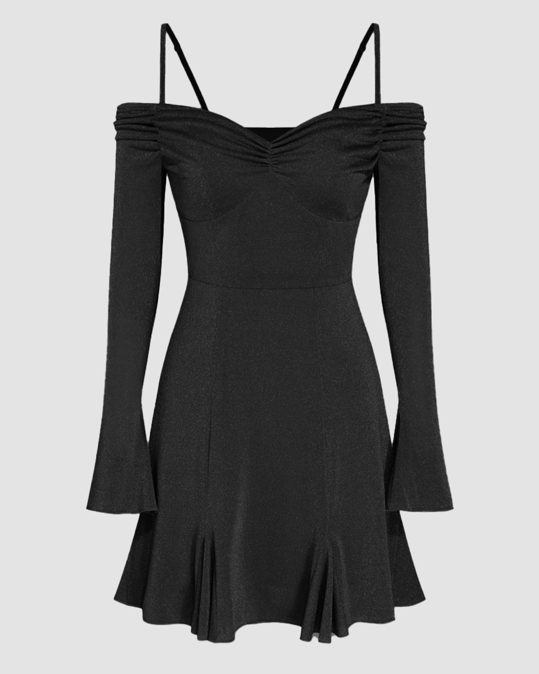 Mesh Glitter Off-Shoulder Ruched Mini Dress in Black comes with a fitted shape and a soft, flexible feel. It has a smooth mesh layer with a light glitter effect that gives the outfit a clean shine. The off-shoulder fit and slim sleeves add a sharp look, while the ruched detail brings structure to the body. This Mini Dress in Black stands out for its neat fall and simple shape, keeping the style modern and fresh.