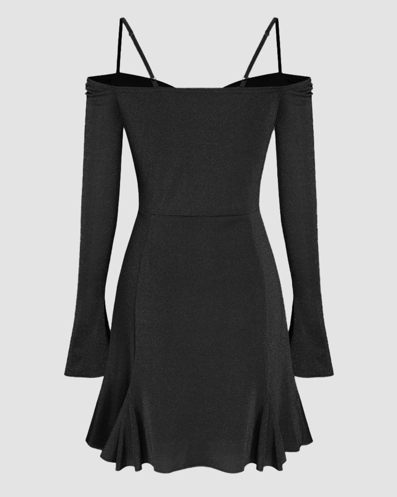 Mesh Glitter Off-shoulder Ruched Mini Dress in Black