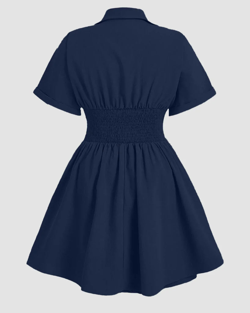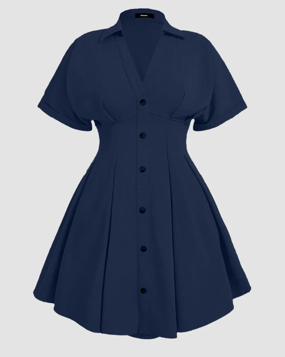Navy Blue Collared Button-Down Pleated A-Line Mini Dress Curve & Plus