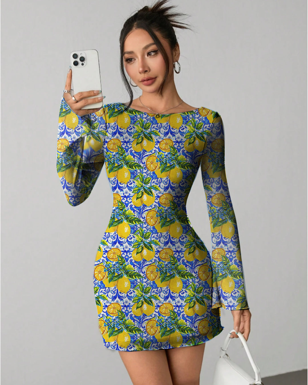 The Printed Full Sleeve Bodycon Mini Dress brings a bright, statement look with its fun print and fitted shape. The smooth stretch fabric sits close to the body and gives a clean outline without feeling tight. With its long sleeves and short length, this Bodycon Mini Dress balances coverage and shape in a simple, stylish way.