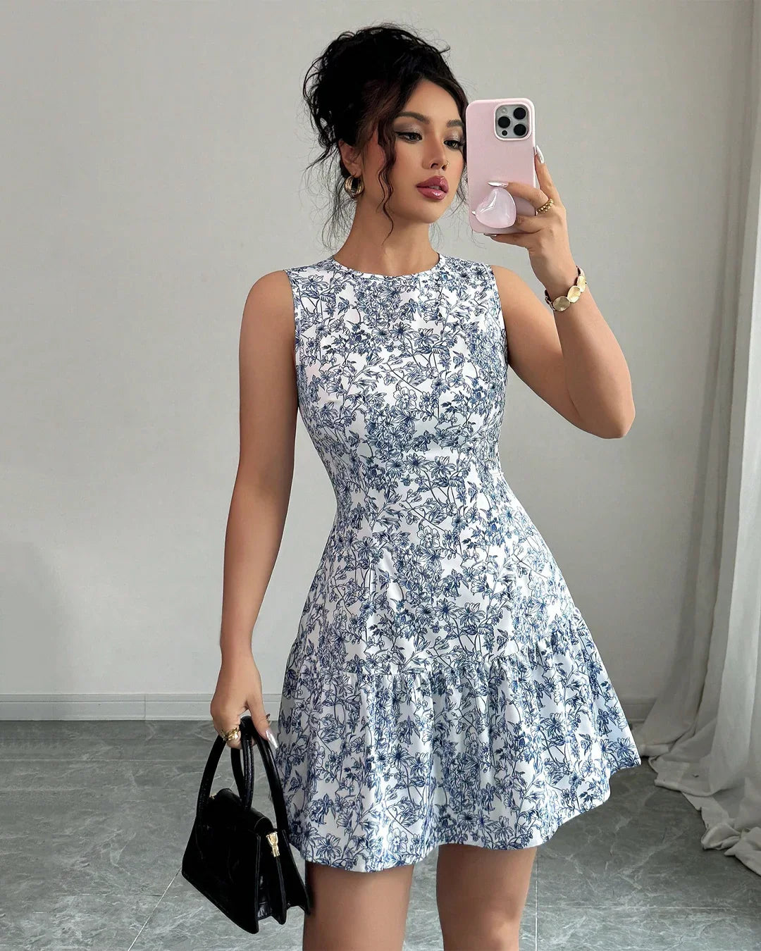 This sleeveless mini dress brings a fresh and feminine vibe to your wardrobe. Designed with a flattering fit & flare silhouette, it features a soft floral print that adds charm to your look. The sleeveless cut keeps it cool and breezy, making this sleeveless mini dress perfect for brunch, outings, or casual evenings.