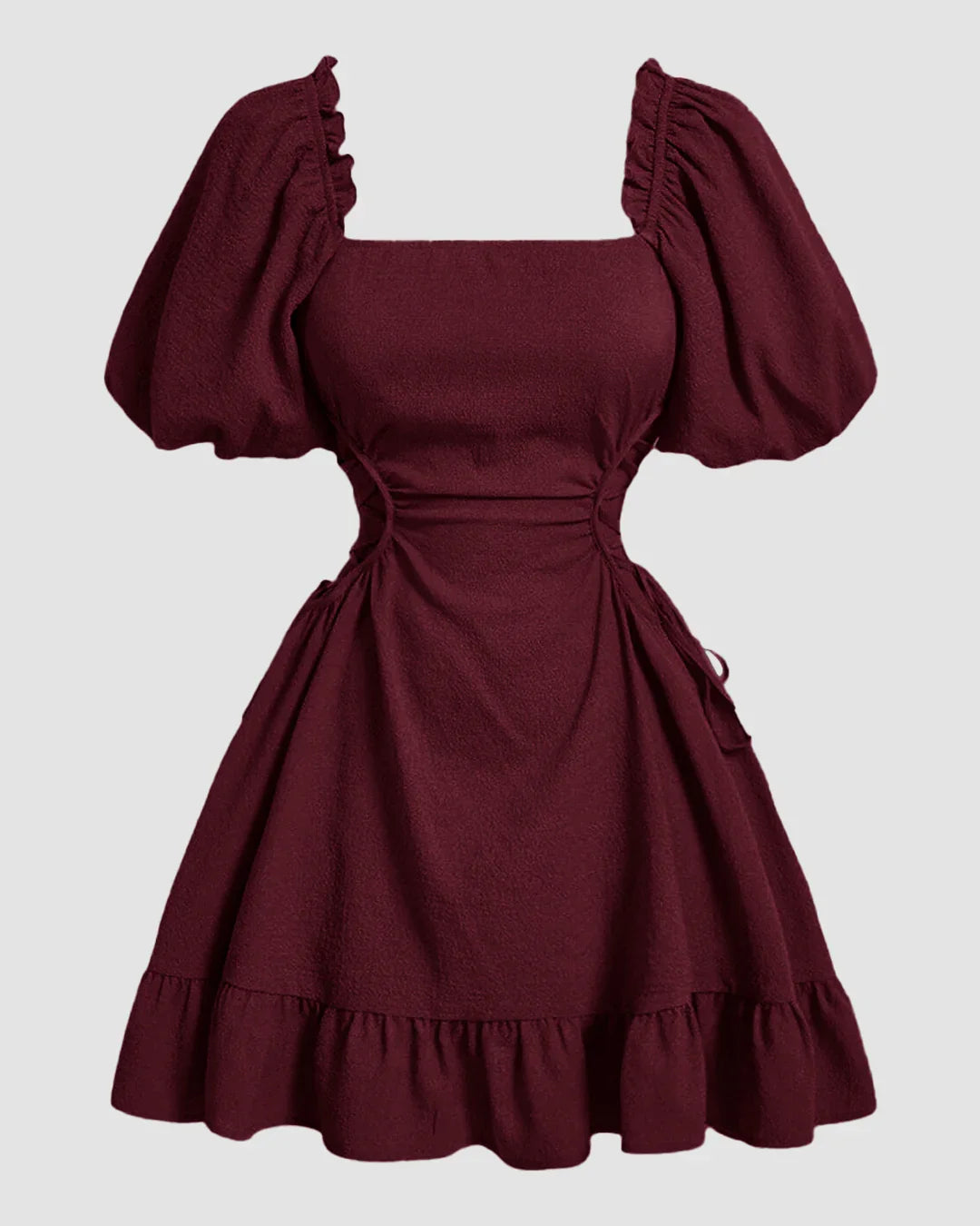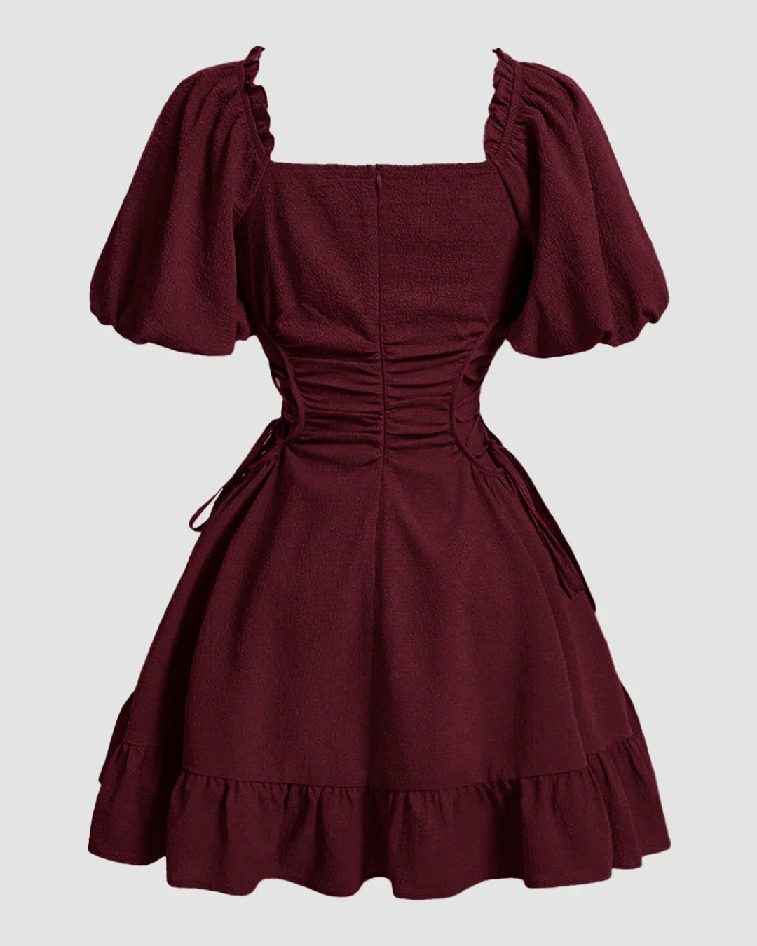 The Solid Lace Up Side Ruffle Dress in Maroon is your statement pick for effortless charm. Featuring voluminous puff sleeves, a square neckline, and ruffle trim detailing, this maroon dress gives a flattering fit with its lace-up side design that cinches the waist beautifully. The playful yet elegant hemline makes it perfect for brunch dates, parties, or evening outings.