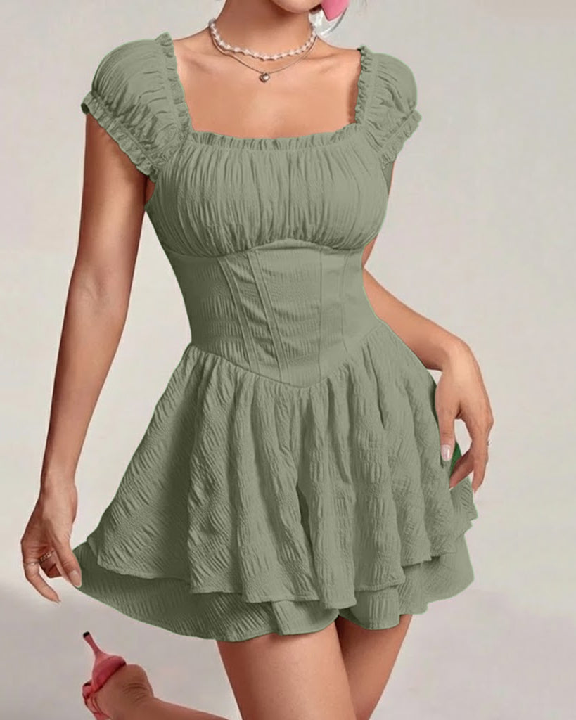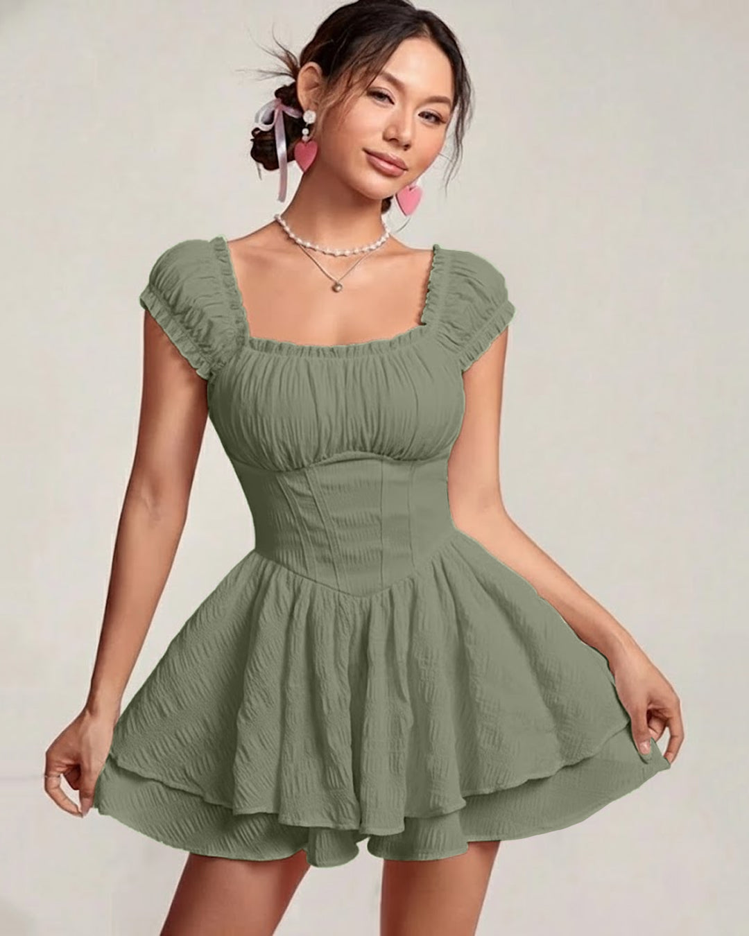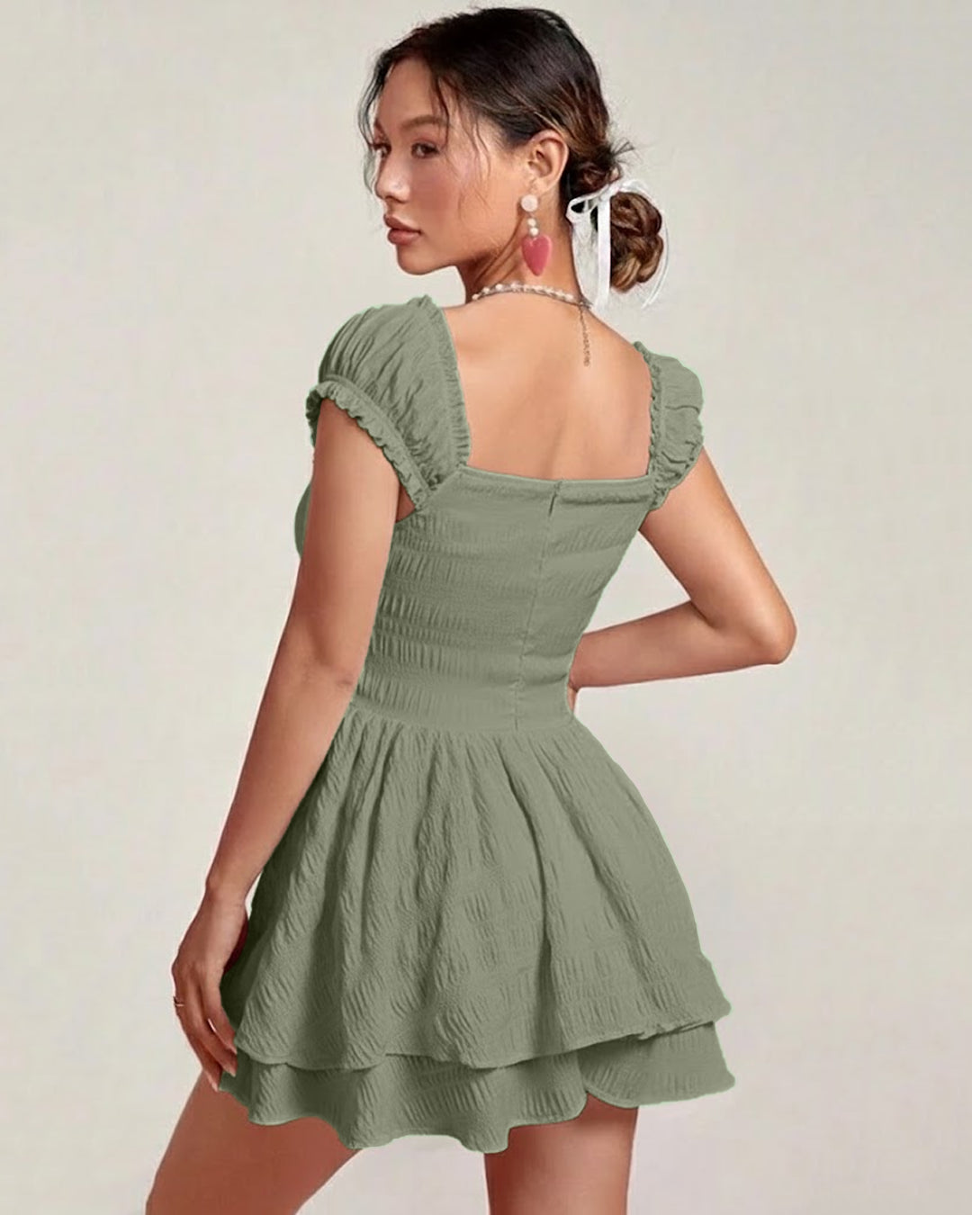 Square Neck Double Layer Short Sleeve Dress In Green comes with a soft, textured fabric and a fitted bodice that gives a flattering shape. This Short Sleeve Dress In Green has a double-layered skirt that adds movement and a playful, feminine look, while the square neckline keeps it modern and cute.