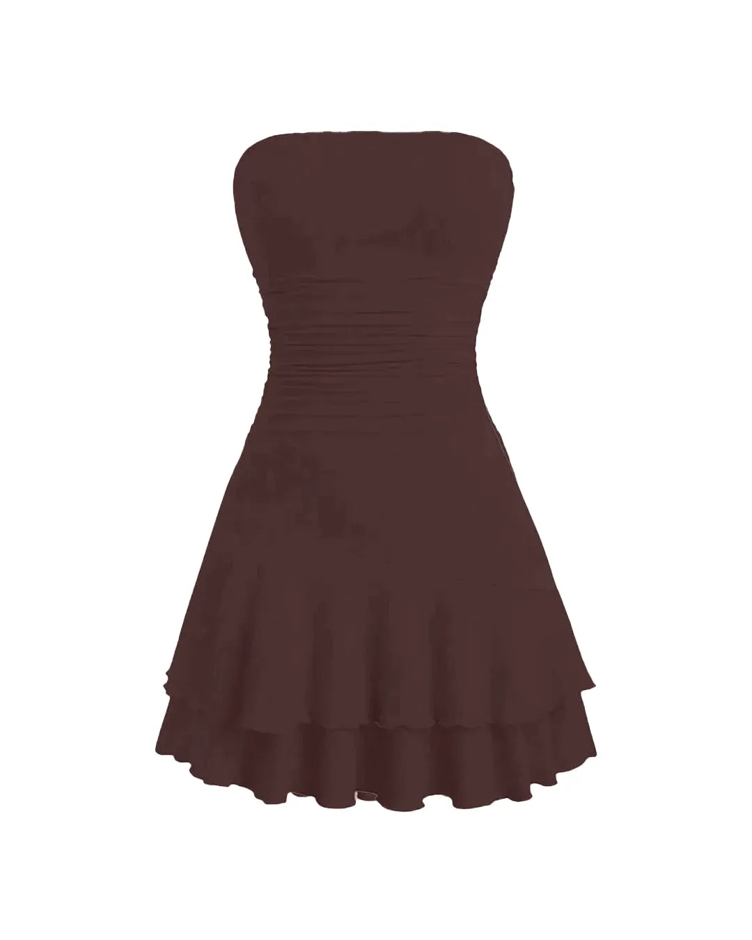 Introducing our Strapless Chocolate Mini Dress With Cinched Waist. This strapless mini dress brings soft drama to your wardrobe with its double-layered ruffle hem and flattering ruched bodice. It’s cute, bold, and totally dance-floor ready.