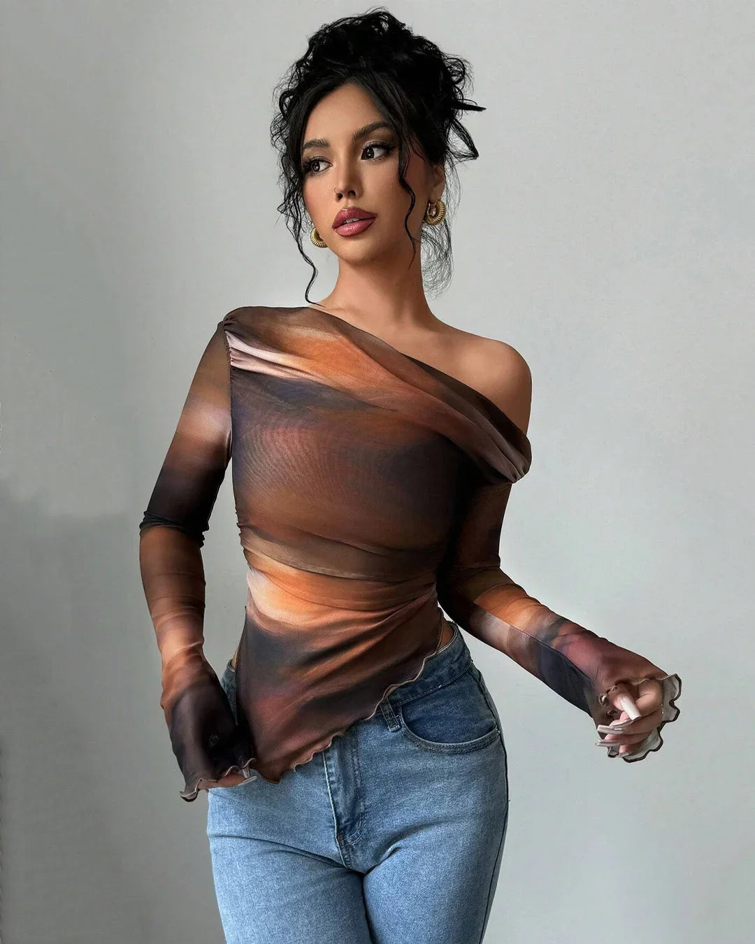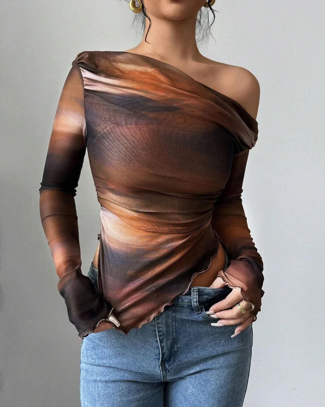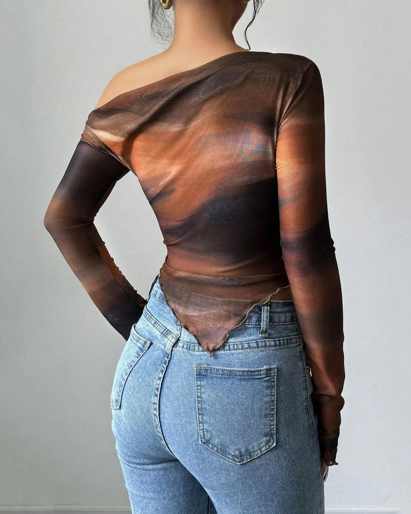 Abstract Print Asymmetric Neck Long Sleeve Fitted Top
