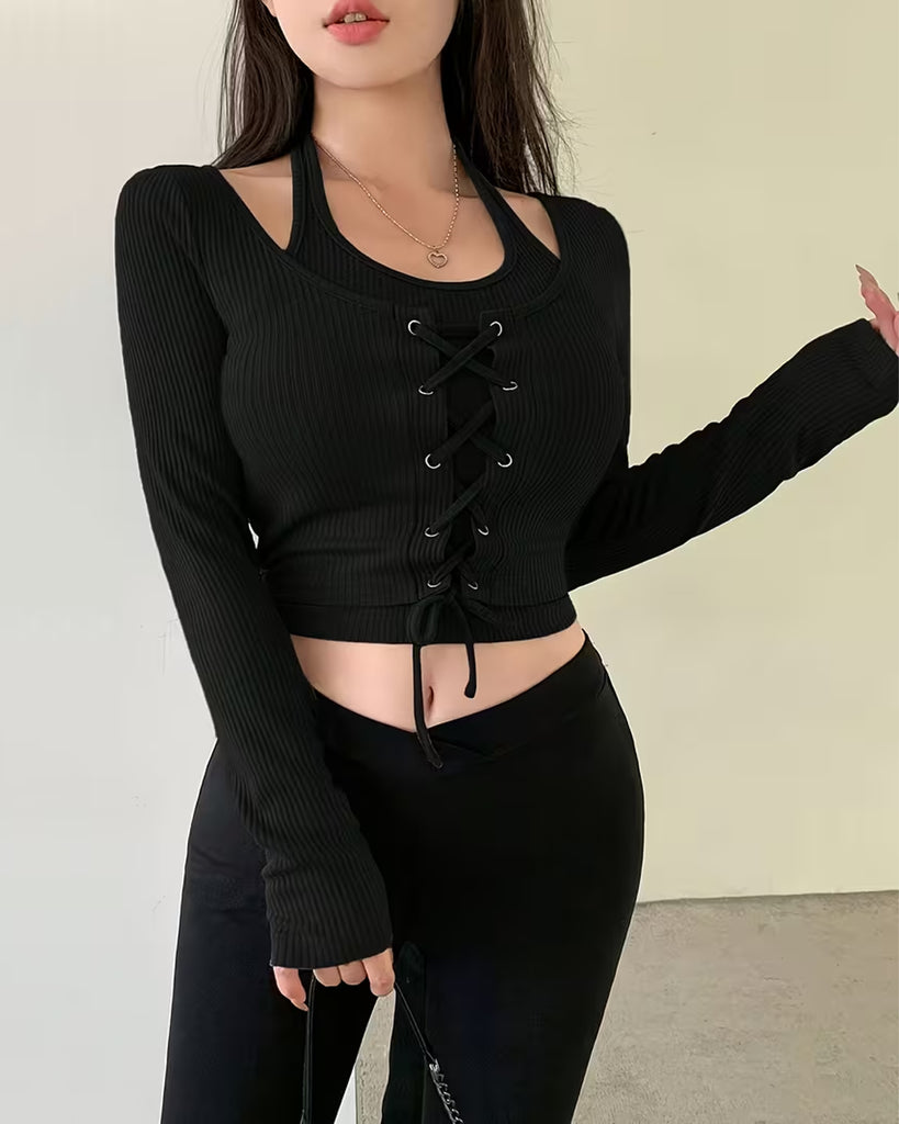 Black Ribbed Long Sleeve Crop Top with Lace-Up Front Detail