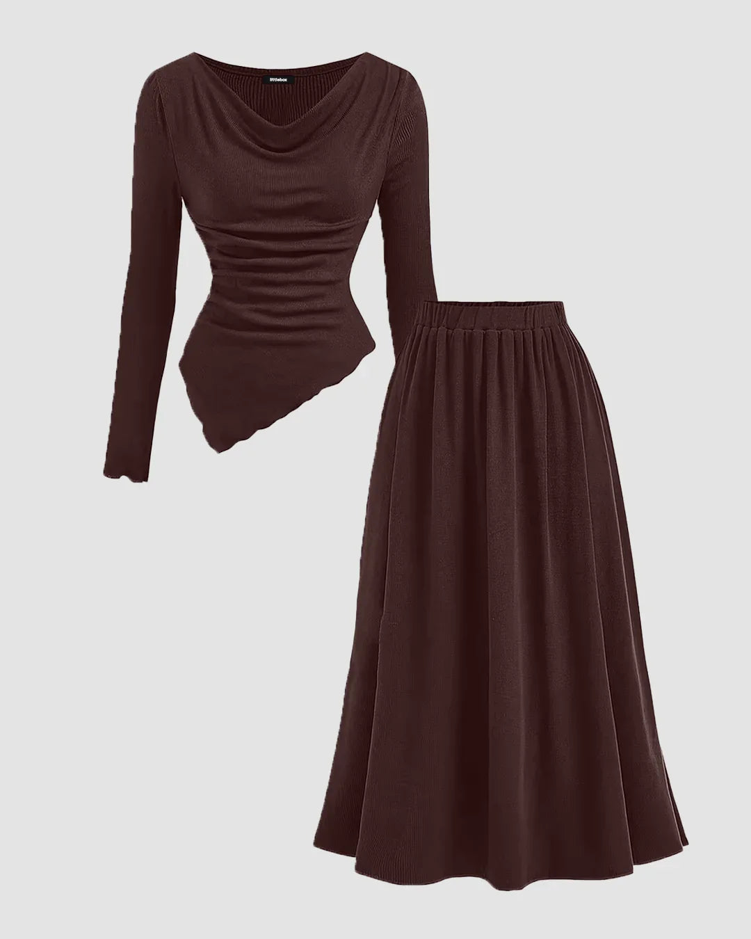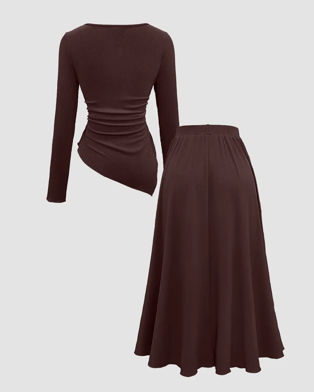 Brown Ribbed Asymmetrical Top & A-Line Skirt Two-Piece Set