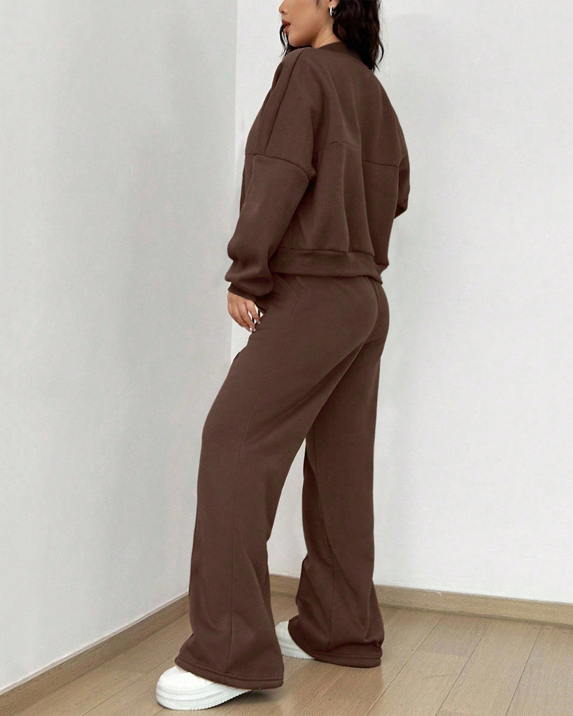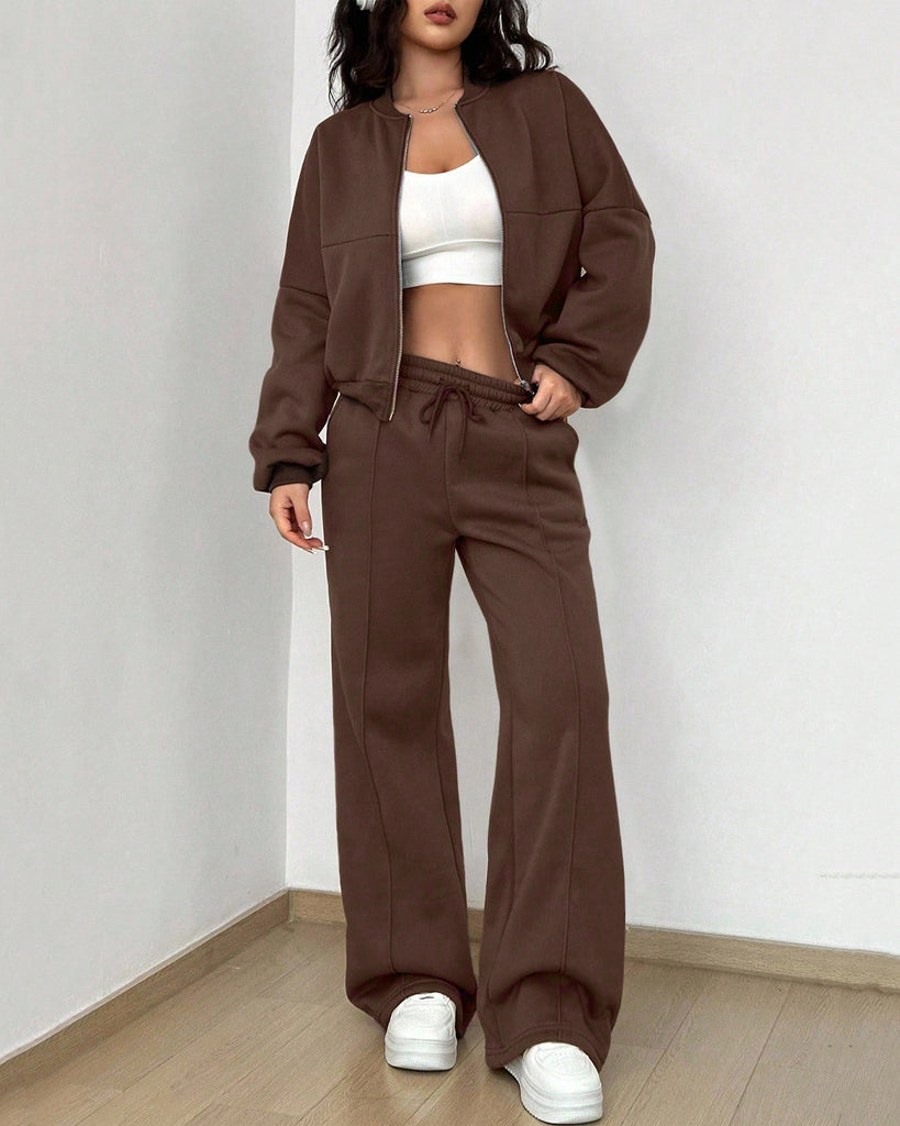 Chocolate Fondae Solid Zip-Up Jacket & Wide-Leg Pants Set