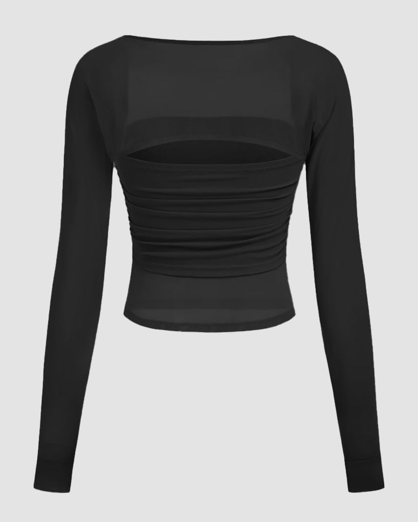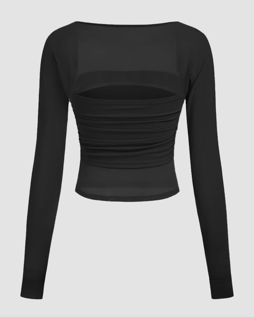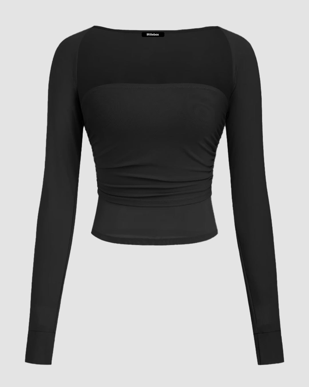 Full Sleeves Ruched Square Neck Crop Top in Black comes with a clean square neckline and soft ruched sides that shape the fit gently. The mesh-style sleeves add a light and airy feel, giving this Square Neck Crop Top in Black a neat, fitted look that stays comfy for long wear. It has a sleek vibe that pairs well with both casual and going-out outfits.