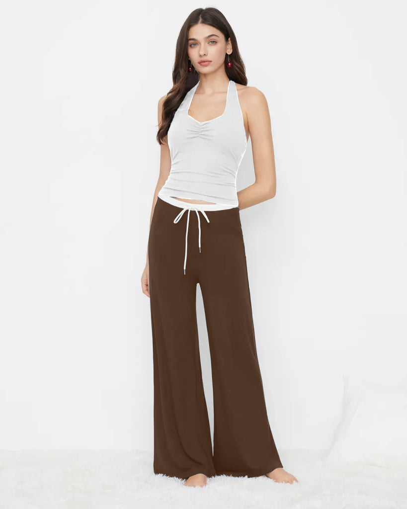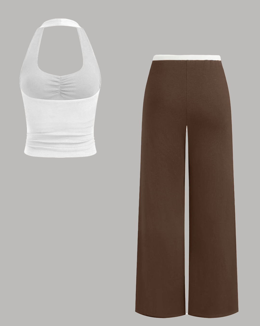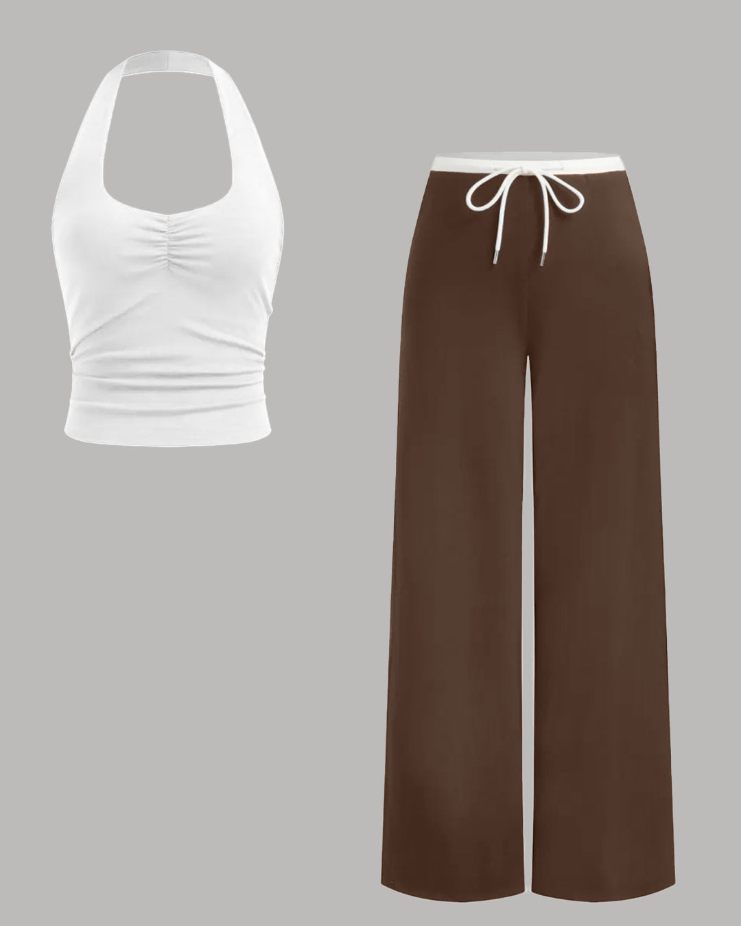 Halter Neck Ruched Top & Mid Rise Drawstring Straight Leg Trousers Set