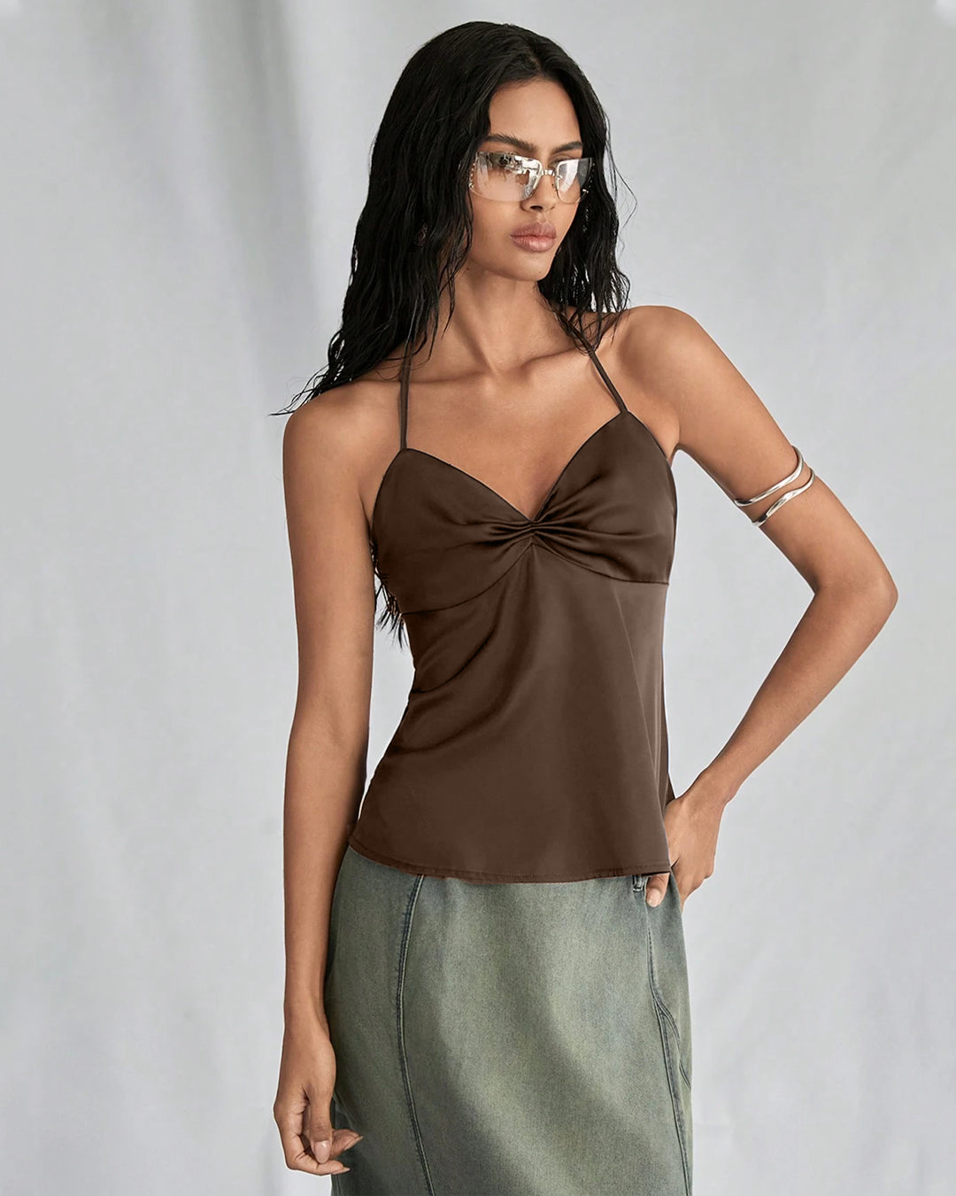 Halter Neck Twist Front Sleeveless Top in brown is giving main character energy. With a sleek halter tie and twist-front detail, this sleeveless top in brown is all about flattering cuts and satin-y flow that moves with you. The deep neckline brings that soft glam energy without doing too much.