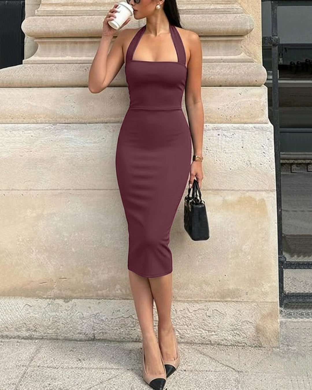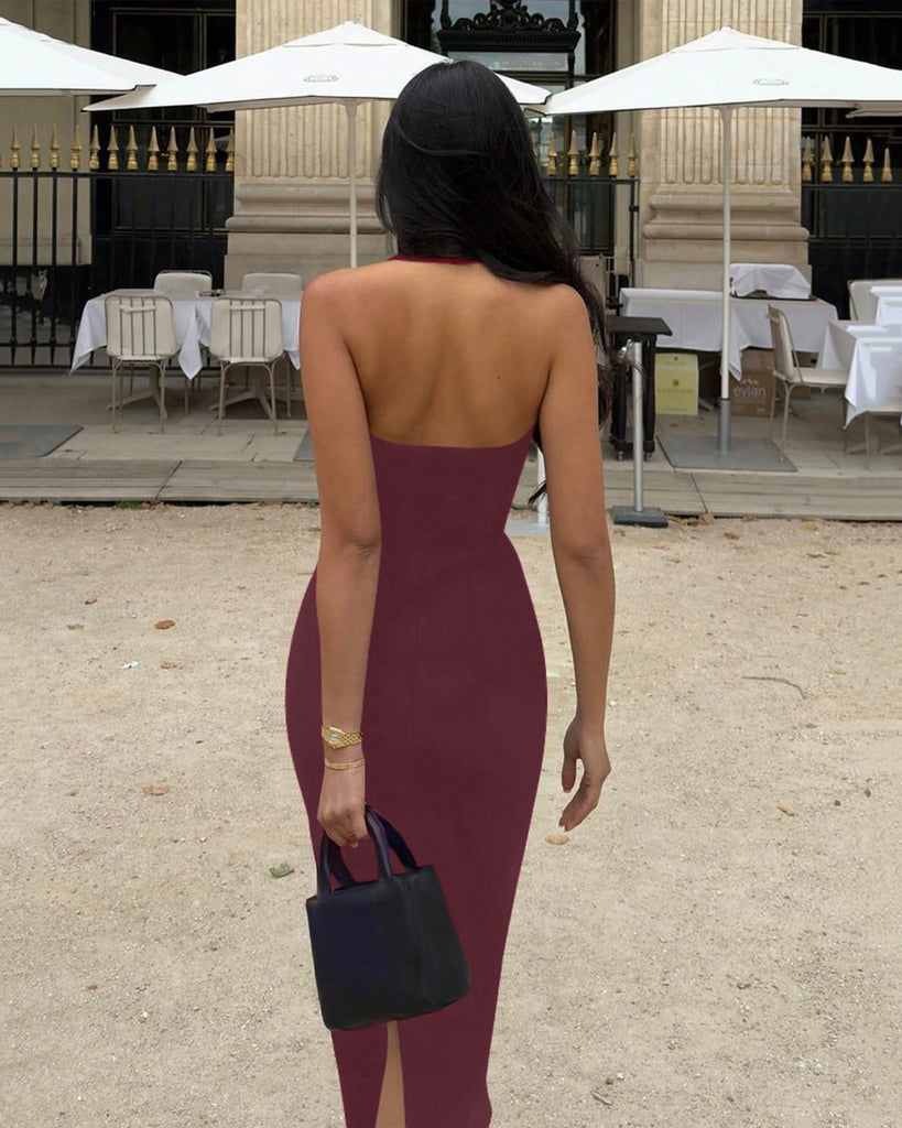 Maroon Halter Neck Solid Bodycon Midi Dress