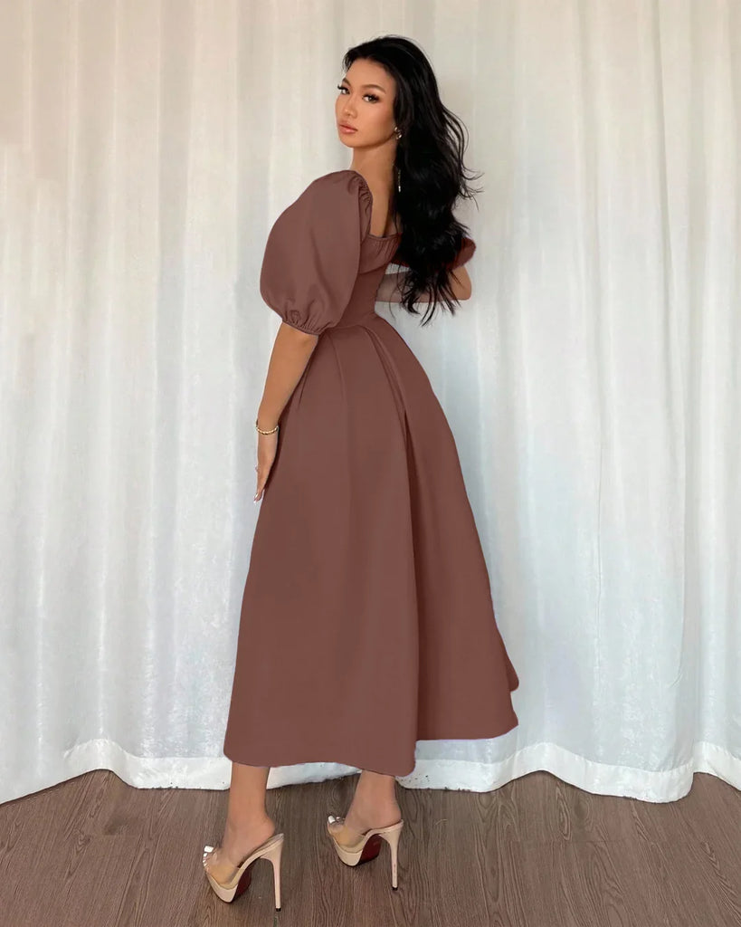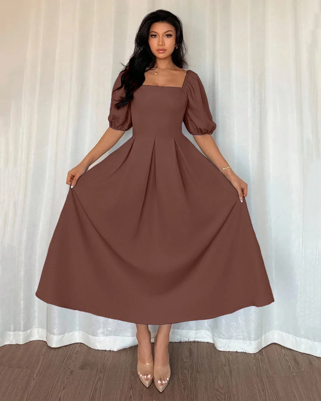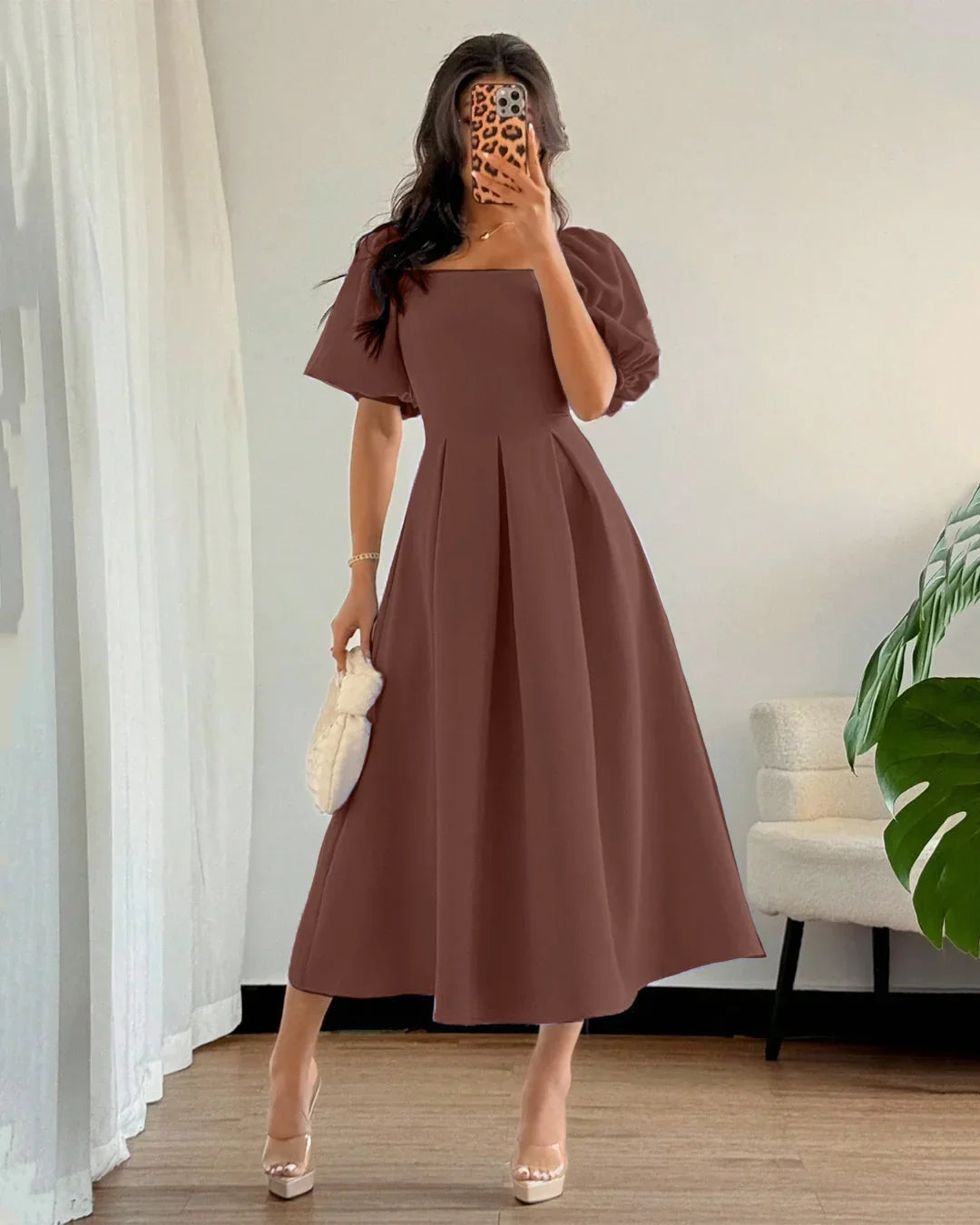 Minimalist Pleated Hem A Line Dress With Puff Sleeves in Brown