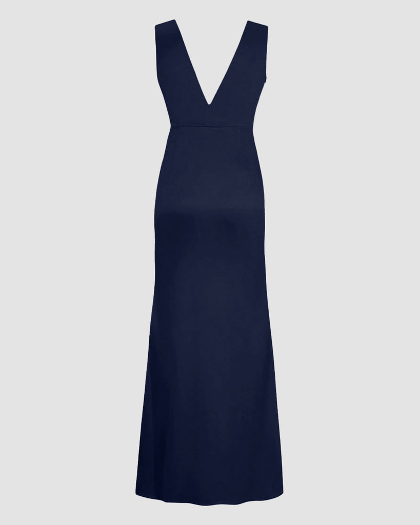 Navy Blue Deep V-Neck Sleeveless Satin Bodycon Maxi Dress
