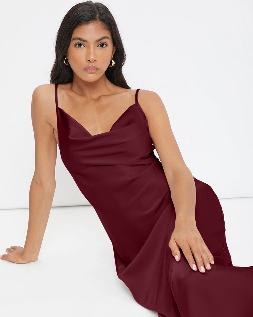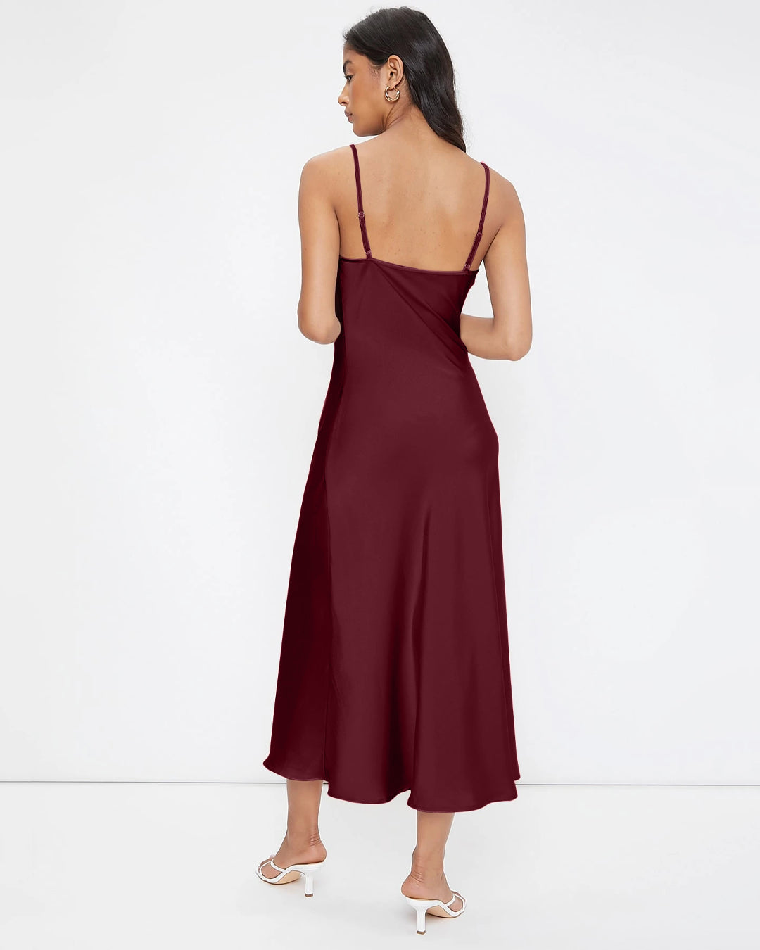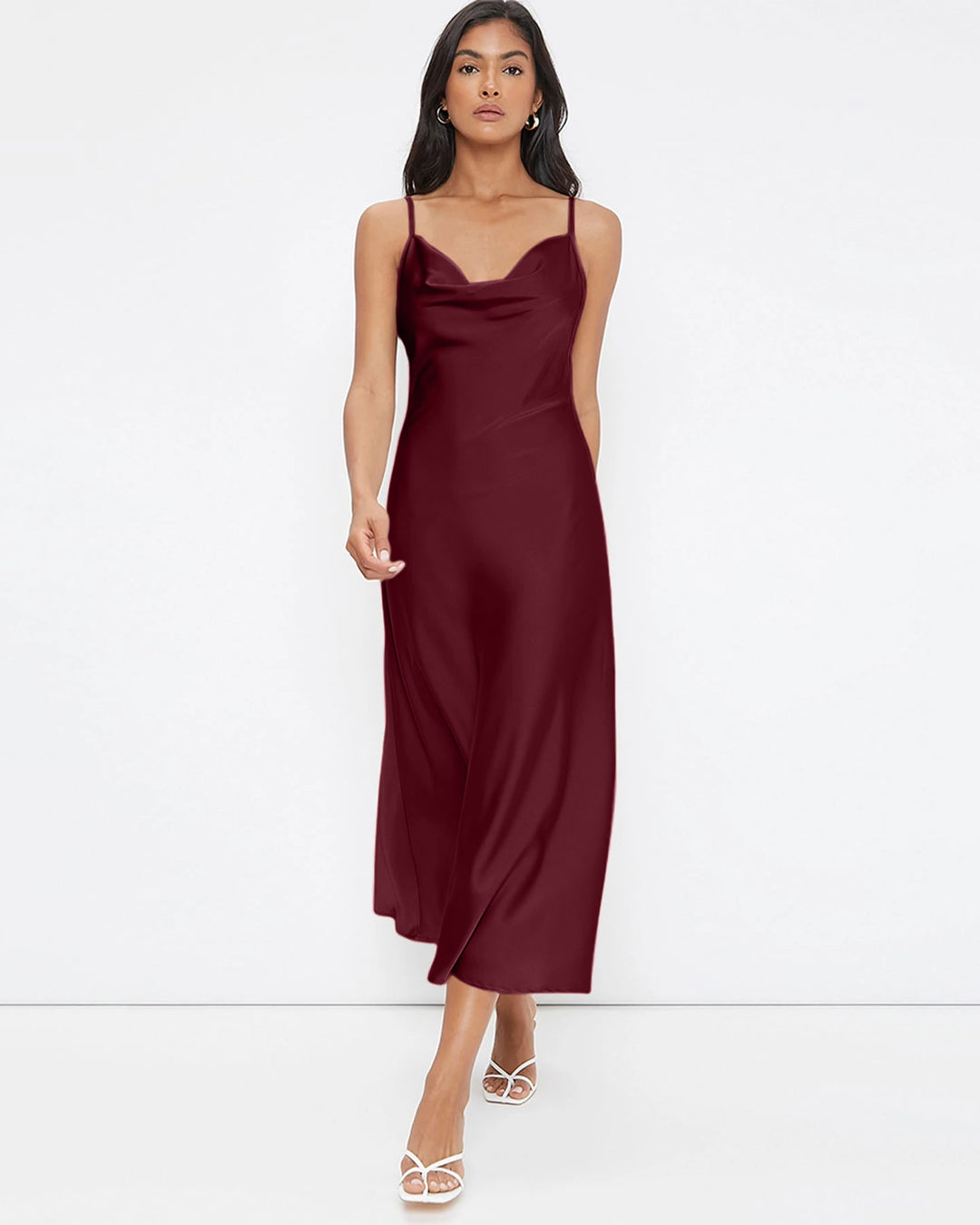 Red Cowl Neck Spaghetti Strap Satin Sleeveless Midi Dress