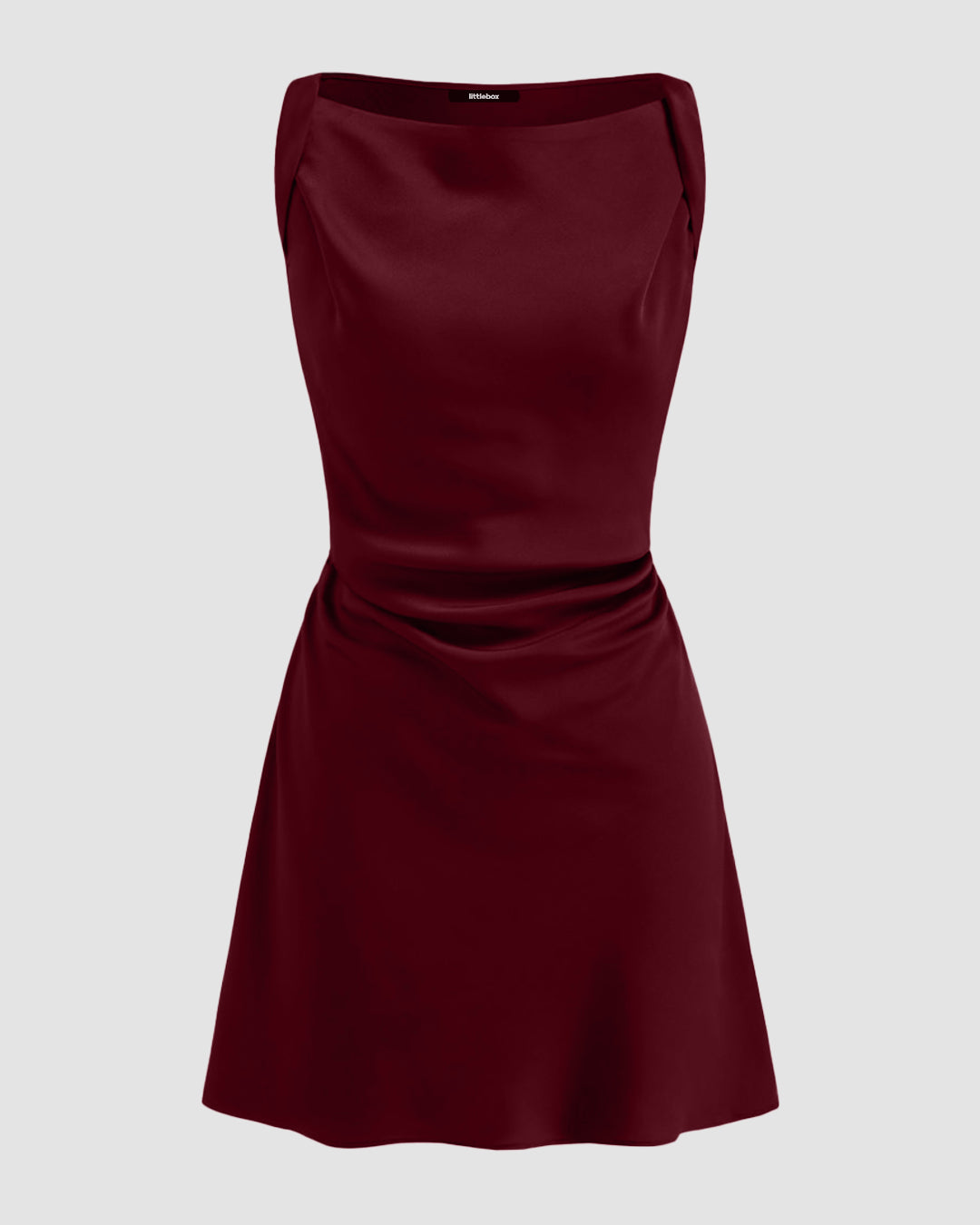 This mini dress in red is made for when the vibe is soft, glam, and ready to turn heads. With a sleek boat neckline and body-skimming silhouette, it adds subtle structure while the ruched side waist detail enhances your natural curves. The satin shine takes it up a notch, making it the perfect choice for date nights or cocktail RSVPs.