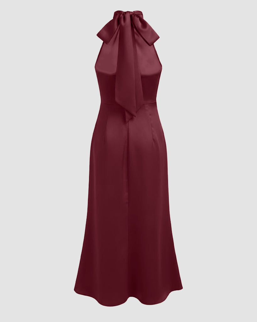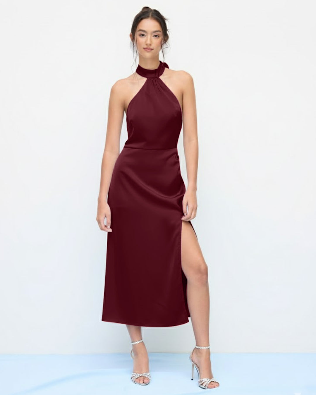 Satin Halter Neckline Split Knotted Midi Dress in Red