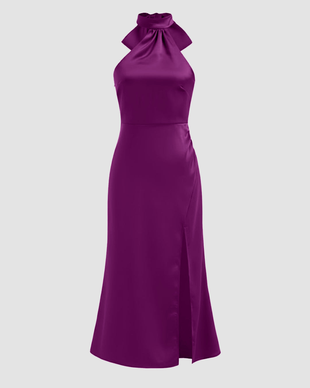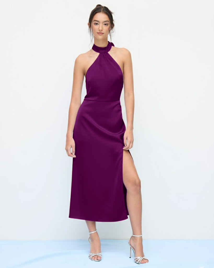 Satin Halter Neckline Split Knotted Midi Dress in wine brings a soft, flowy shape with a smooth finish that feels luxe without trying too hard. The halter neck frames your shoulders neatly, while the side knot detail adds a clean, flattering drape. The slit gives it a subtle lift that balances the fitted top and relaxed skirt. The fabric has a smooth satin feel that moves easily and adds a light shine.