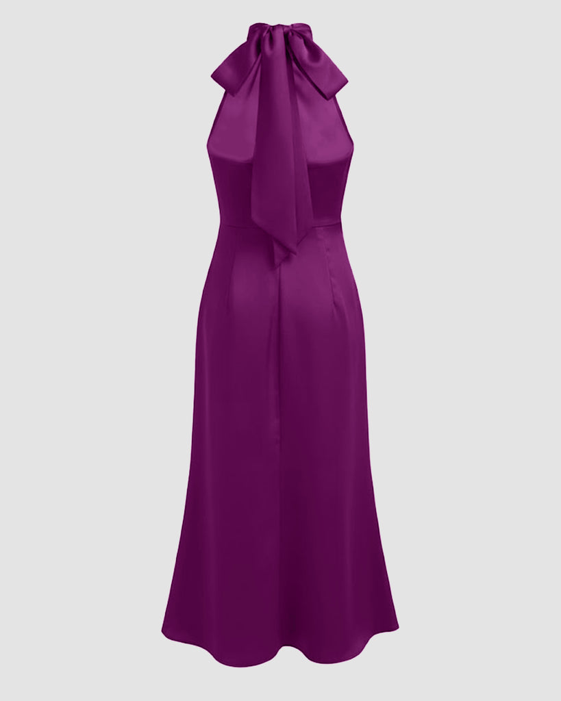 Satin Halter Neckline Split Knotted Midi Dress in Wine