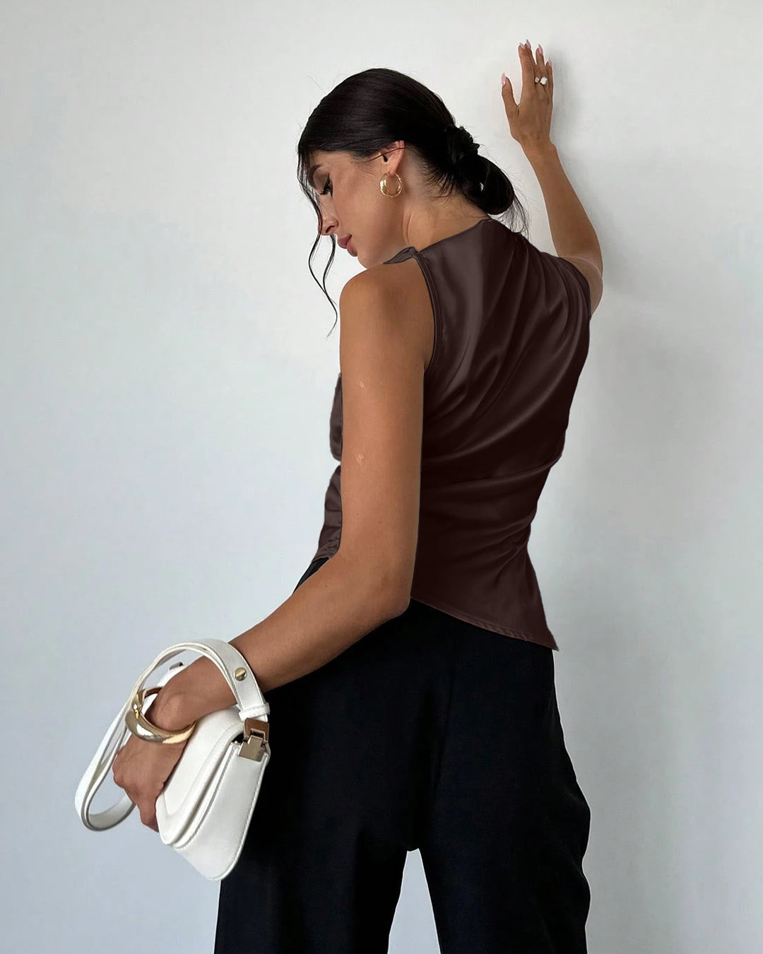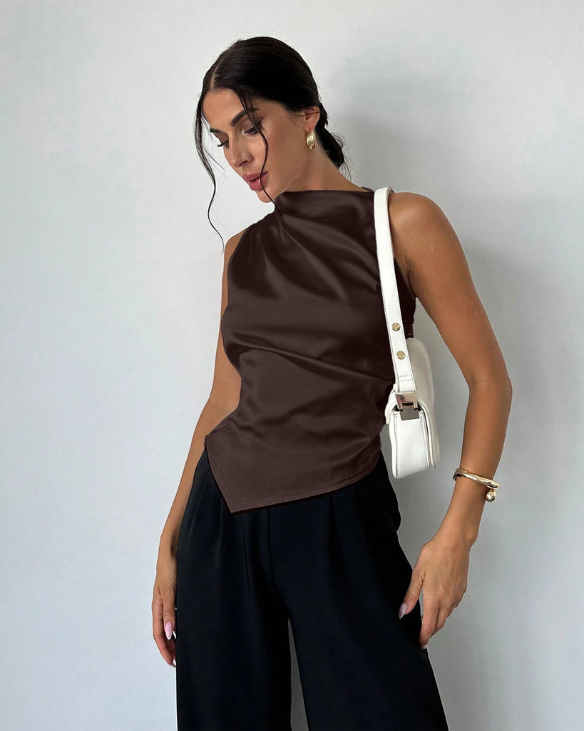 Satin Sleeveless High Neck Asymmetrical Hem Top in Coffee