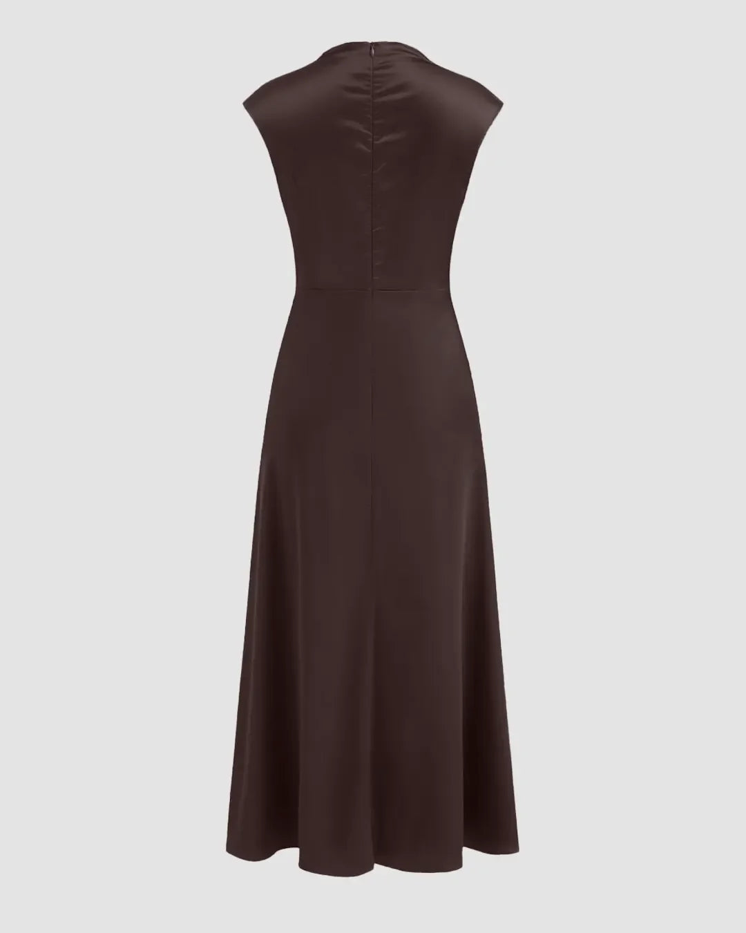 Satin Stand Collar Short Sleeve Asymmetrical Hem Midi Dress in Brown