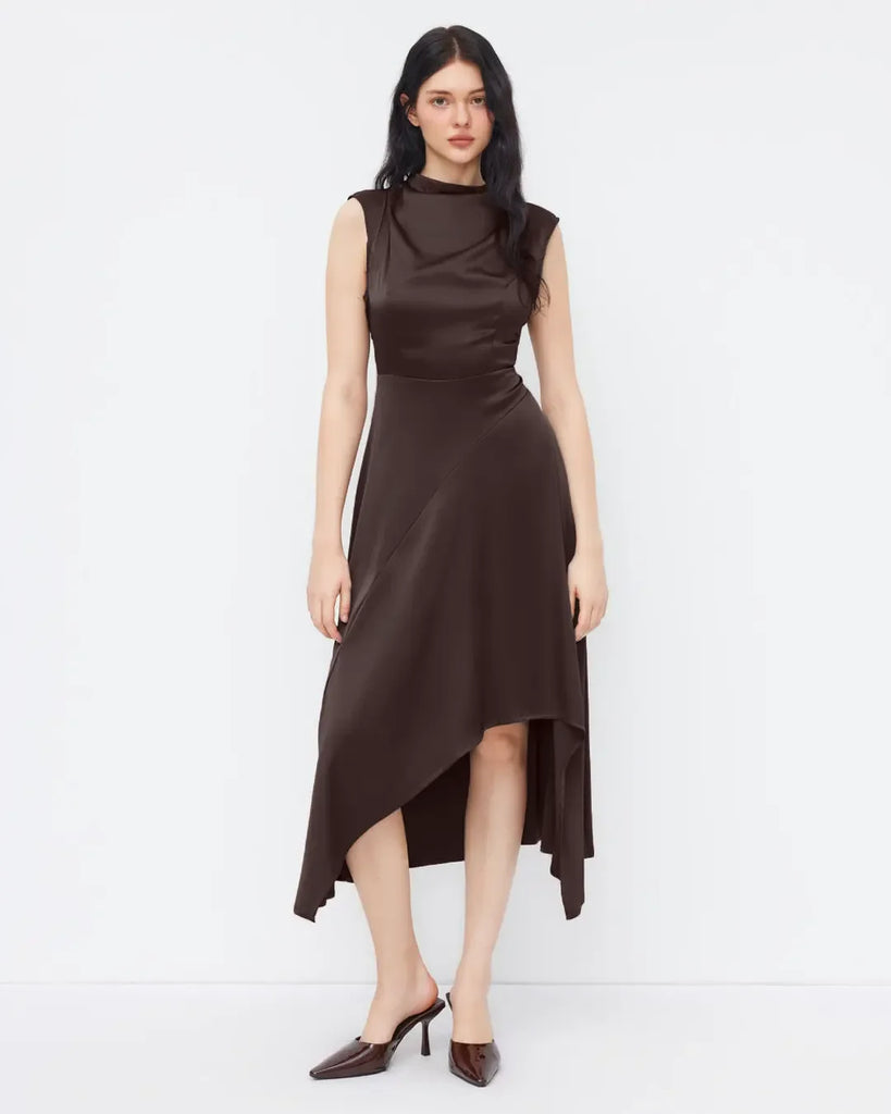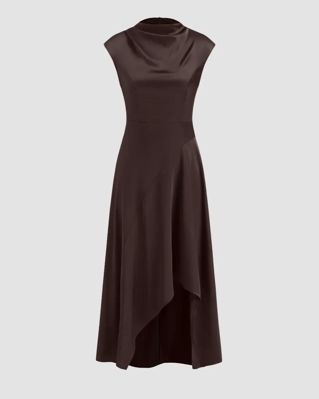 Satin Stand Collar Short Sleeve Asymmetrical Hem Midi Dress in Brown brings a sleek, polished look with its smooth satin feel and modern cut. The stand collar adds a clean, structured touch, while the short sleeves keep it easy and wearable. This Midi Dress has an asymmetrical hem that gives soft movement and adds a little drama without going over the top. The fabric drapes neatly over the body, making it look refined and chic for any setting.