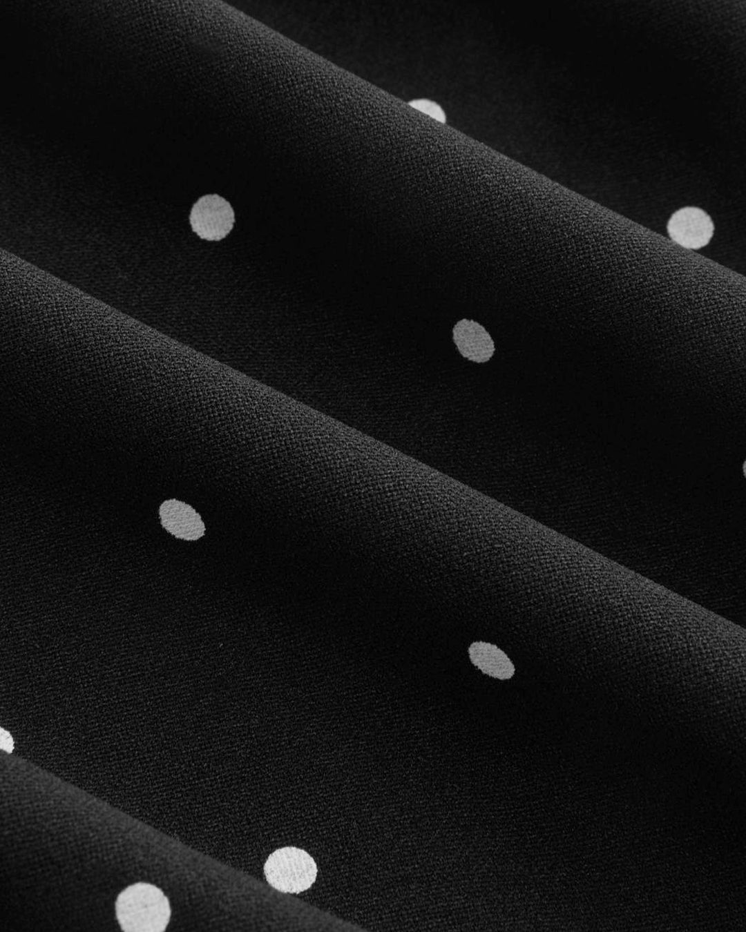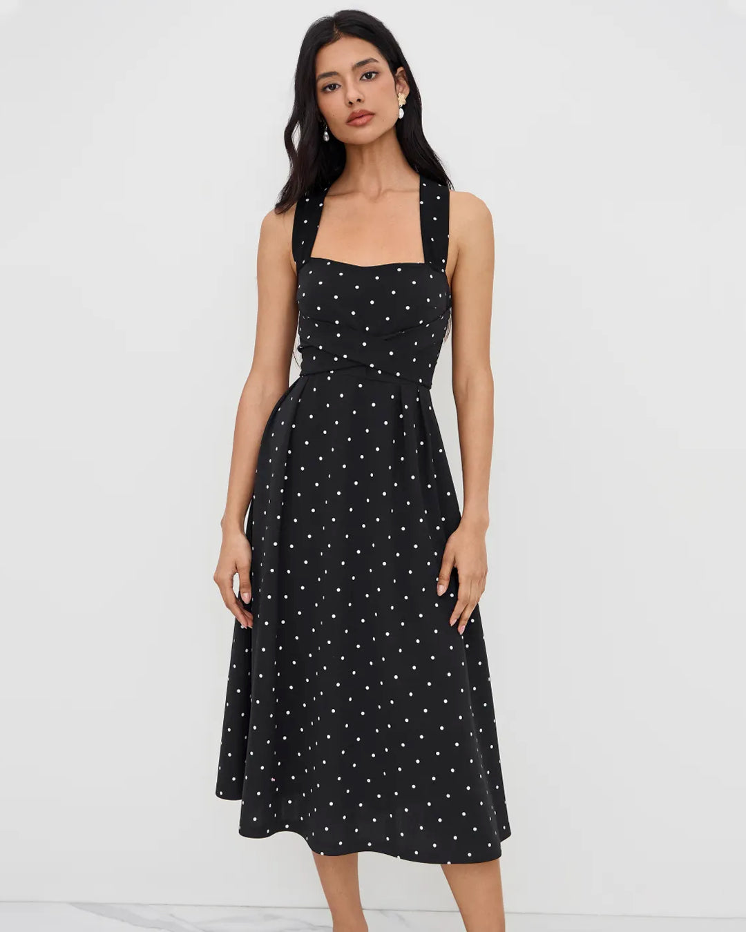 Square Neck Polka Dot Ruffle Criss Cross Maxi Dress comes with a soft square neckline and a fitted bodice that gives a clean shape. This Polka Dot Maxi Dress has a criss-cross strap back and a flowy ruffle hem that adds light movement. The classic black base with small white dots keeps the look timeless and easy to style.