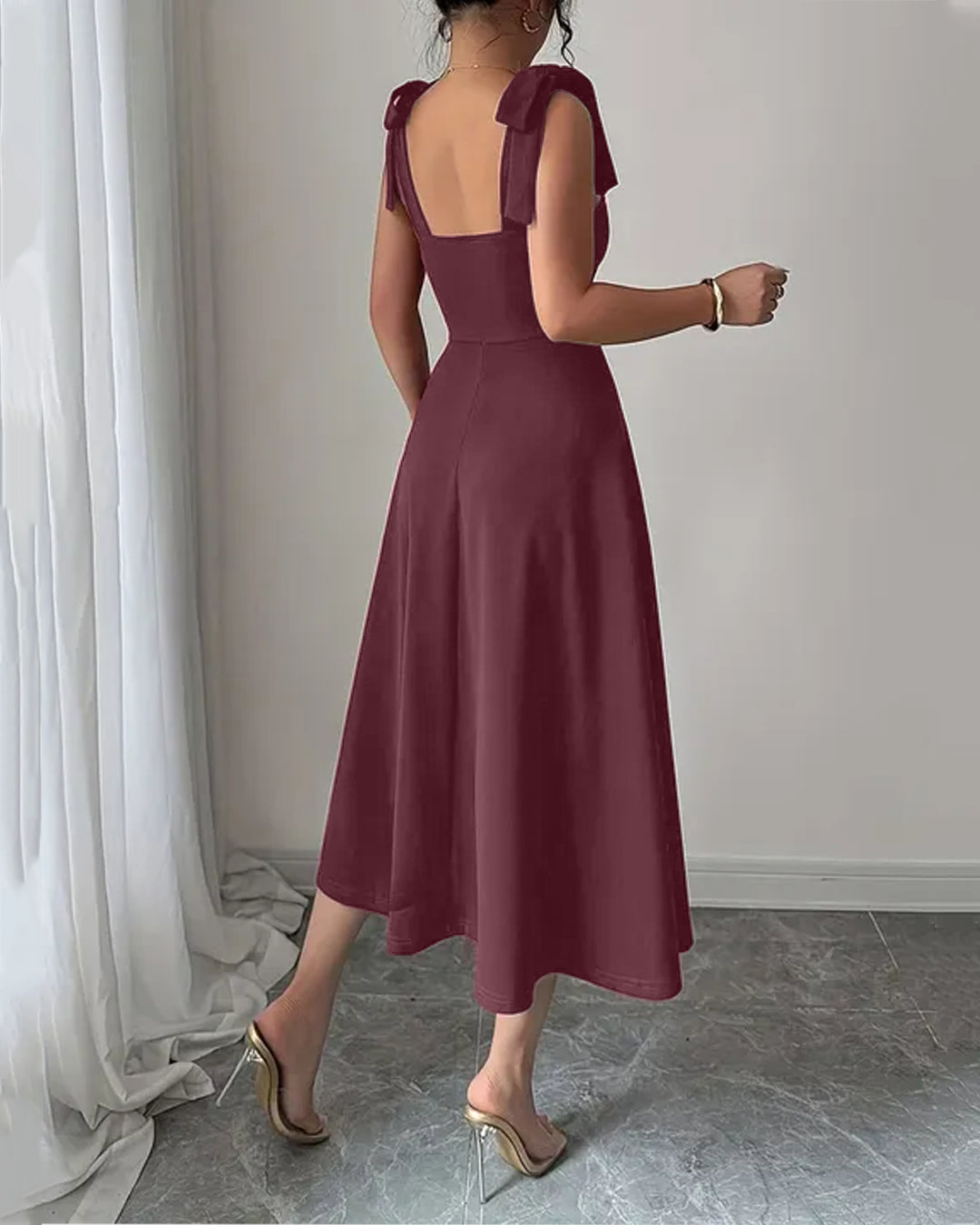 Sweetheart Neck Flared Midi Dress in Maroon comes with a soft fit-and-flare shape that highlights the waist and gives a smooth, flowy look. The sweetheart neckline with tie straps adds a cute and feminine touch, making this sweetheart neck midi dress in maroon perfect for both simple outings and dressy plans. The fabric has a slight stretch that keeps it comfy while holding the structure well.