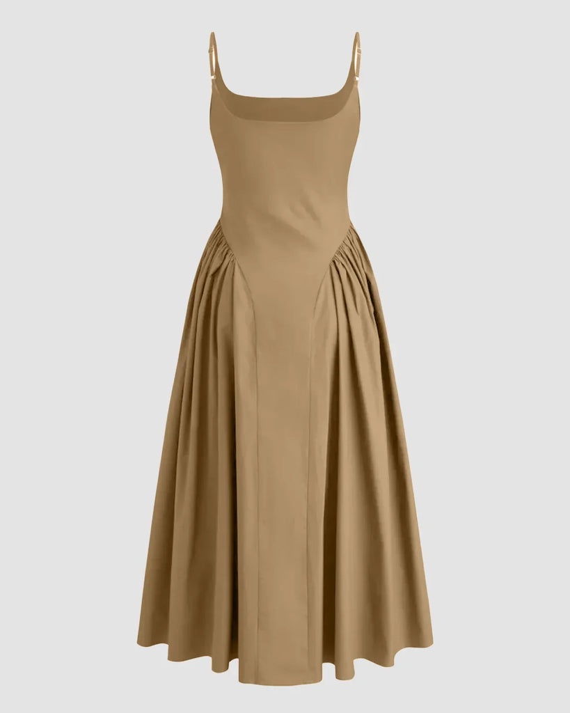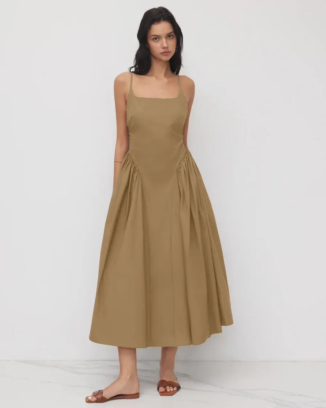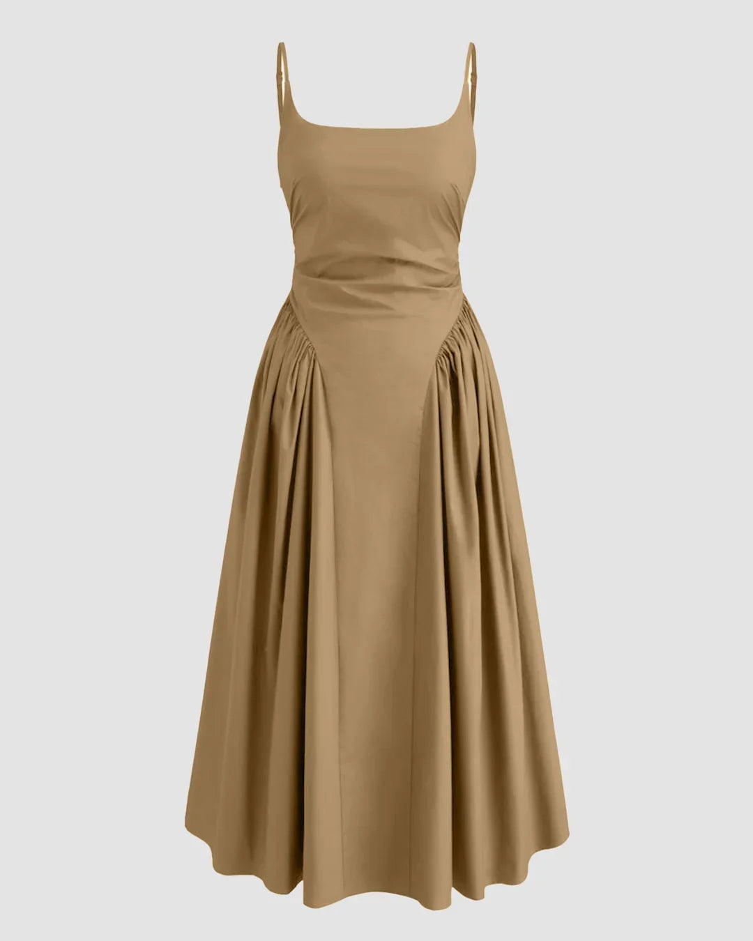 U-neckline Ruched Ruffle Hem Maxi Cami Dress in Mud