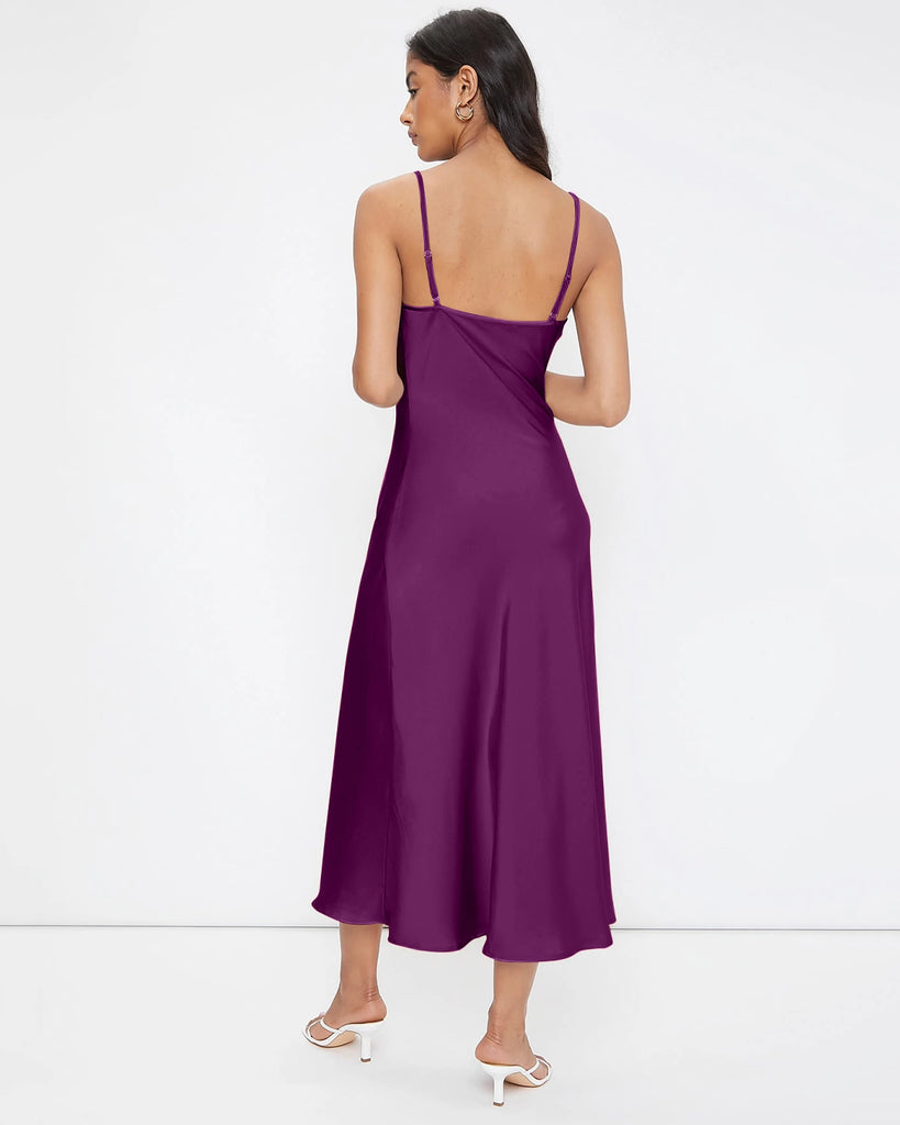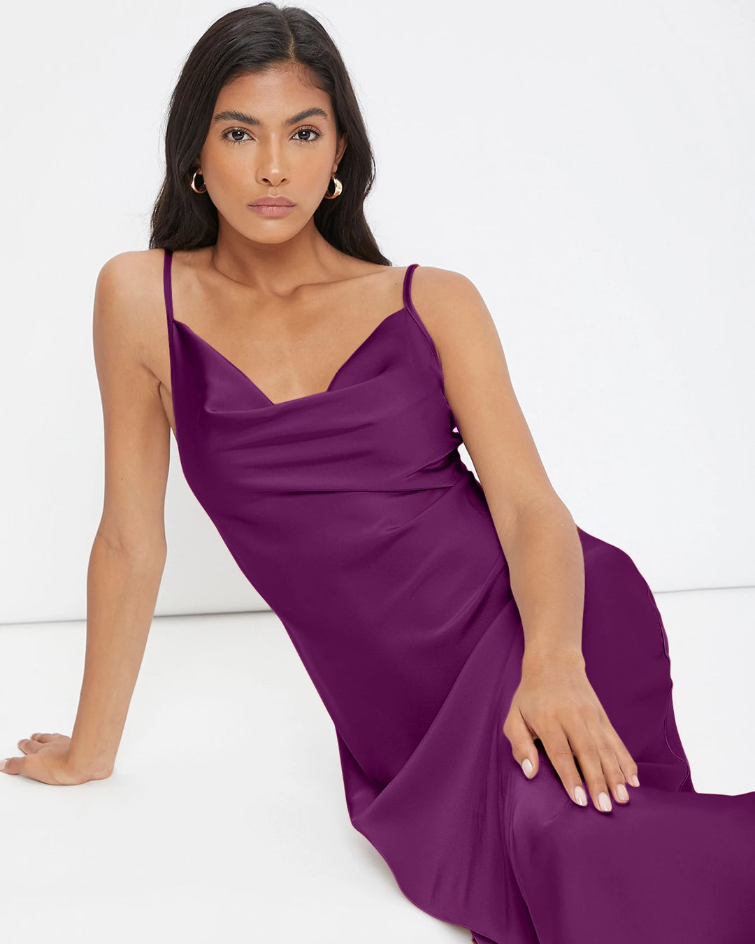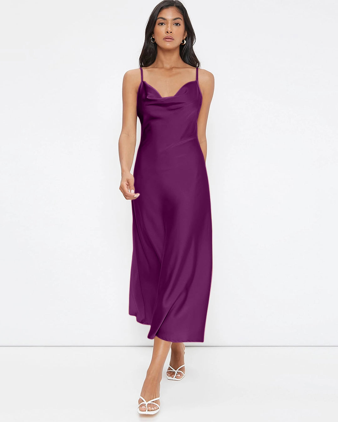 Wine Cowl Neck Spaghetti Strap Satin Sleeveless Midi Dress