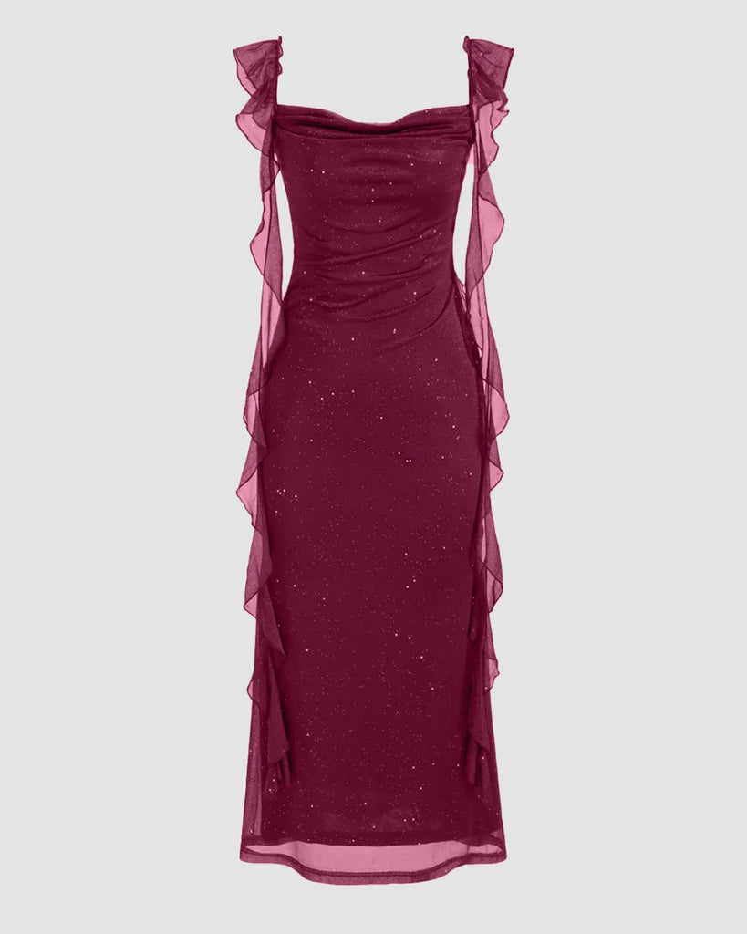 Maroon Ruched Ruffle Mesh Sleeveless Bodycon Midi Dress