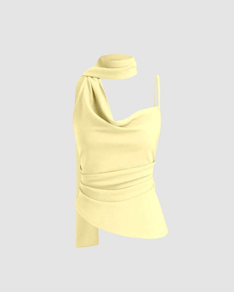 Choker Neck Cold Shoulder Draped Front Ruched Top in Off-White