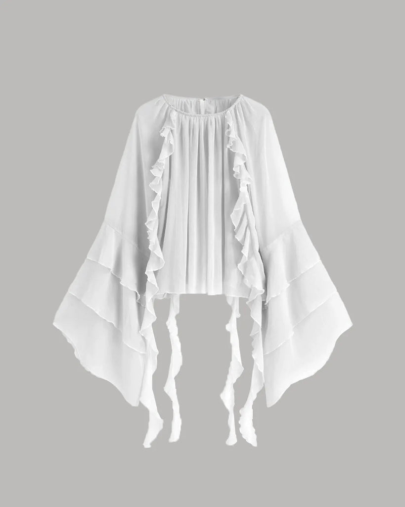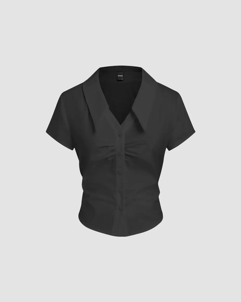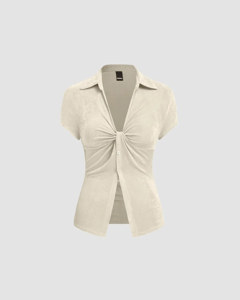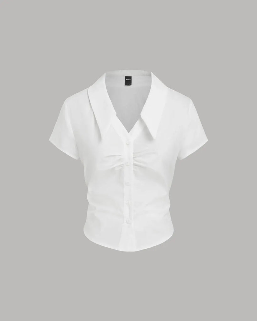White Solid Color Collared Ruched Top with Asymmetric Hem