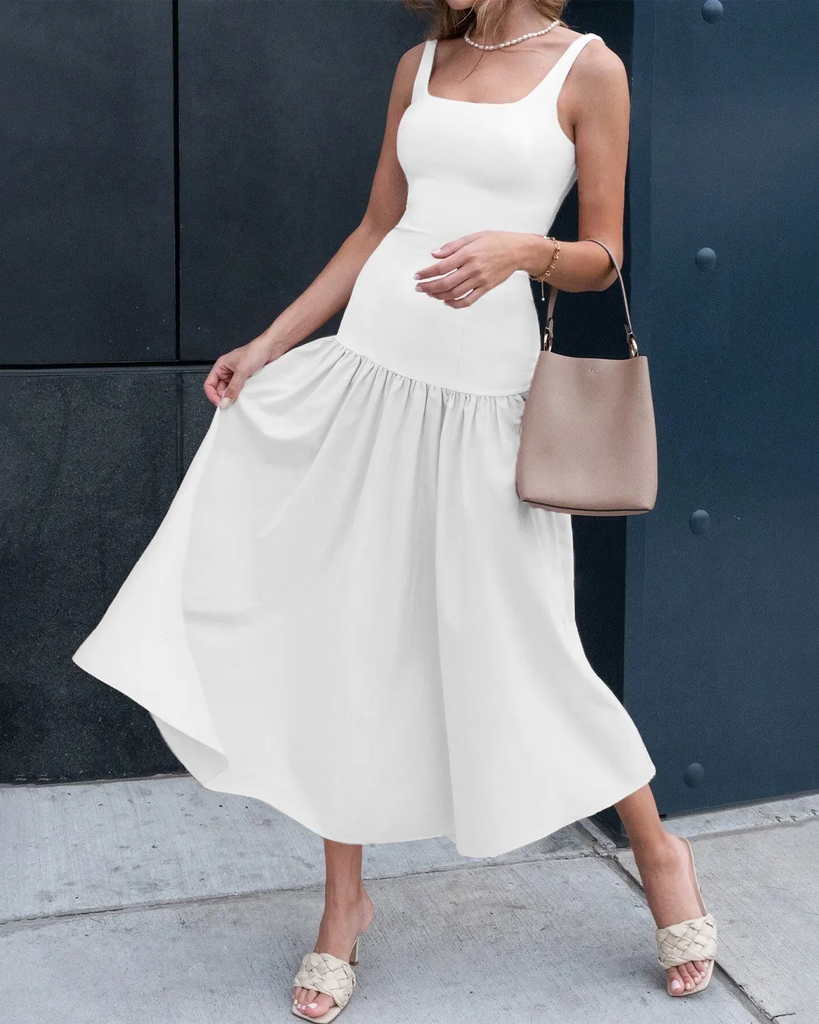Satin Square Neck Ruched Lace Up Maxi Dress in Off White