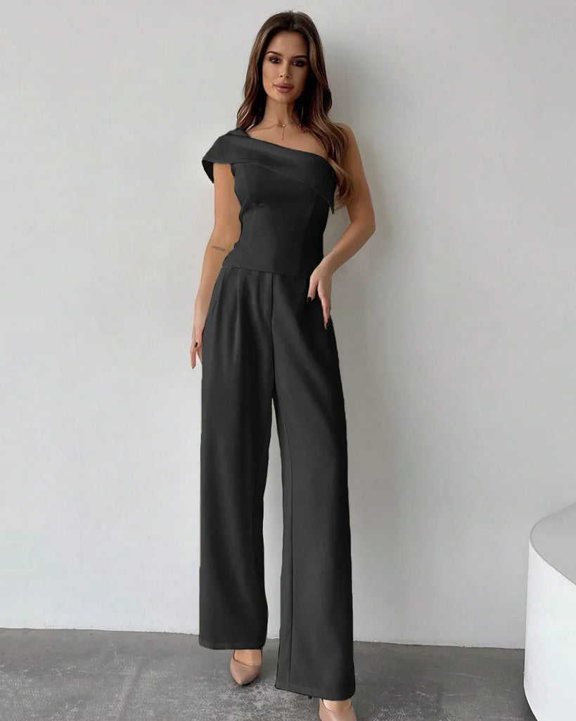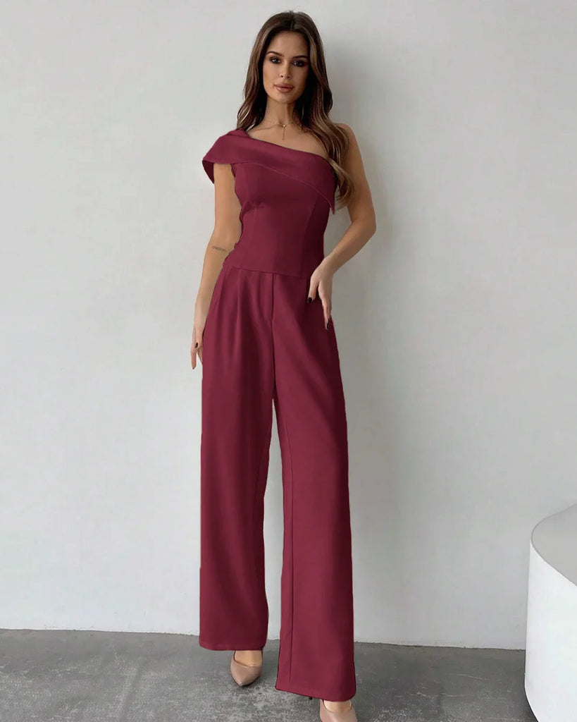 Satin Boat Neck Draped Top & Mid Rise Waist Wide Leg Trousers Set in Off White