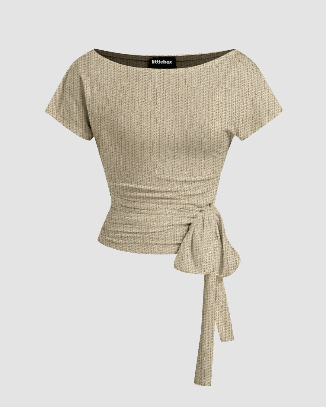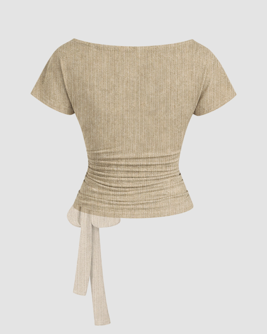 Asymmetrical Neck Short Sleeve Knotted Ruched Top