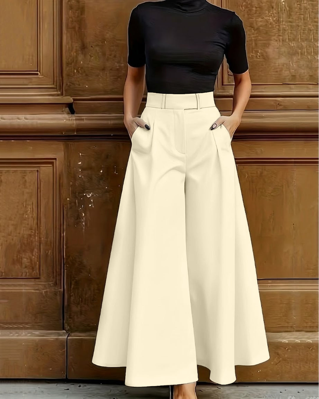 Bell Bottom Pocket Structured Pants in Beige are polished, bold, and designed to make a statement. These bell bottom pants feature a flattering high waist that defines your silhouette while keeping the look structured and elegant. The dramatic wide bell bottom shape creates graceful movement and an elongated leg line. Designed with functional side pockets, these bell bottom pants blend style with everyday practicality. Crafted in a polyester and spandex blend, they feel smooth with a slight stretch for comfortable wear. The beige tone keeps the look refined and versatile.