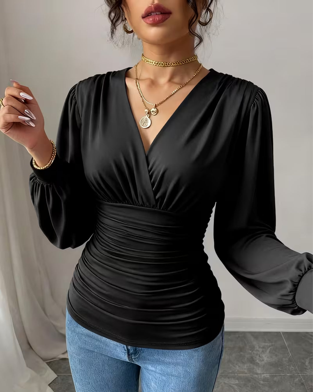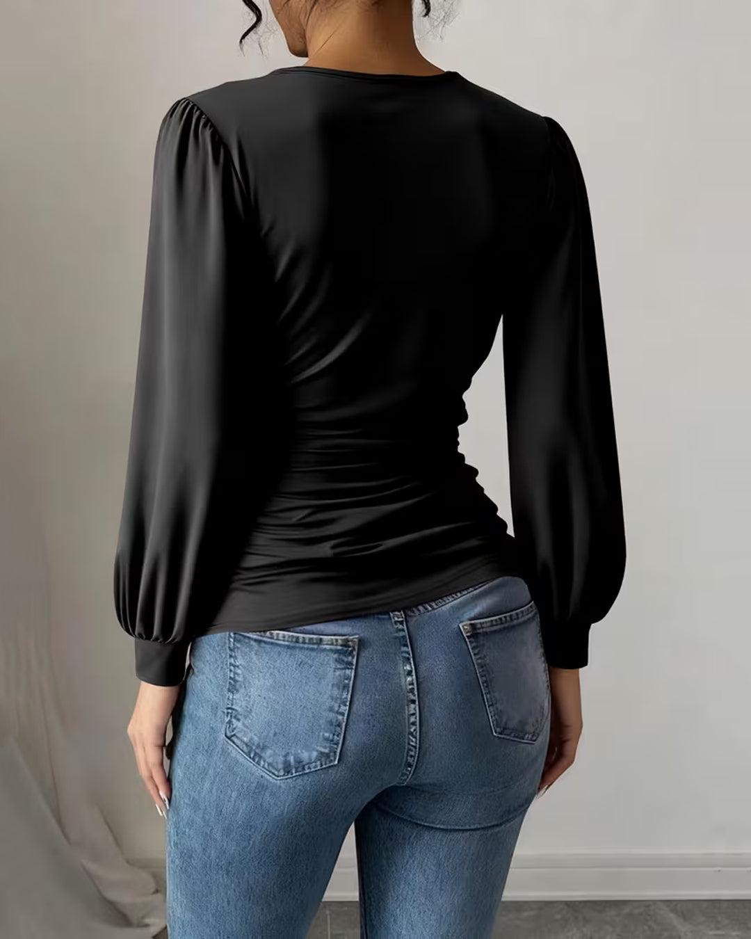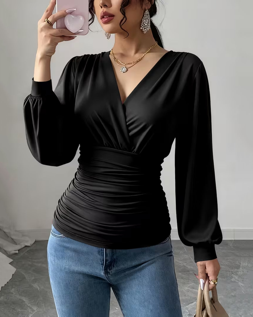 Black Crossover V Neck Ruffled Waist Bubble Long Sleeve Top brings a soft statement vibe with an easy, flattering fit. Designed with a crossover V neckline and a gently ruffled waist, this top naturally shapes the body while keeping things comfortable. The bubble-style long sleeves add volume without feeling heavy, giving the look a balanced and polished finish.