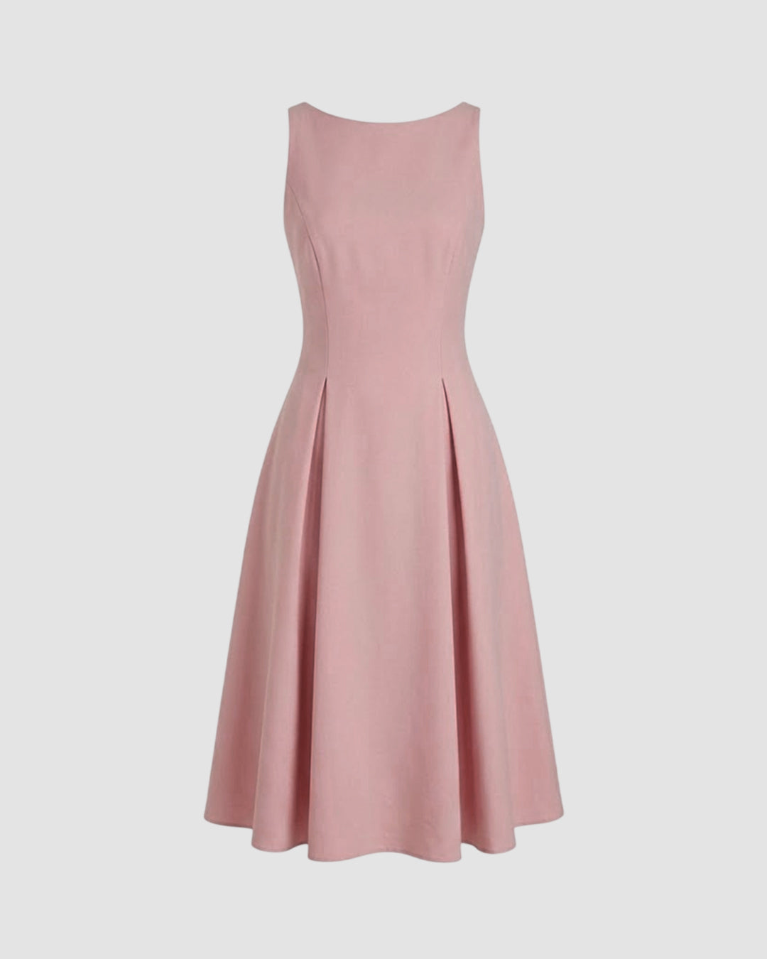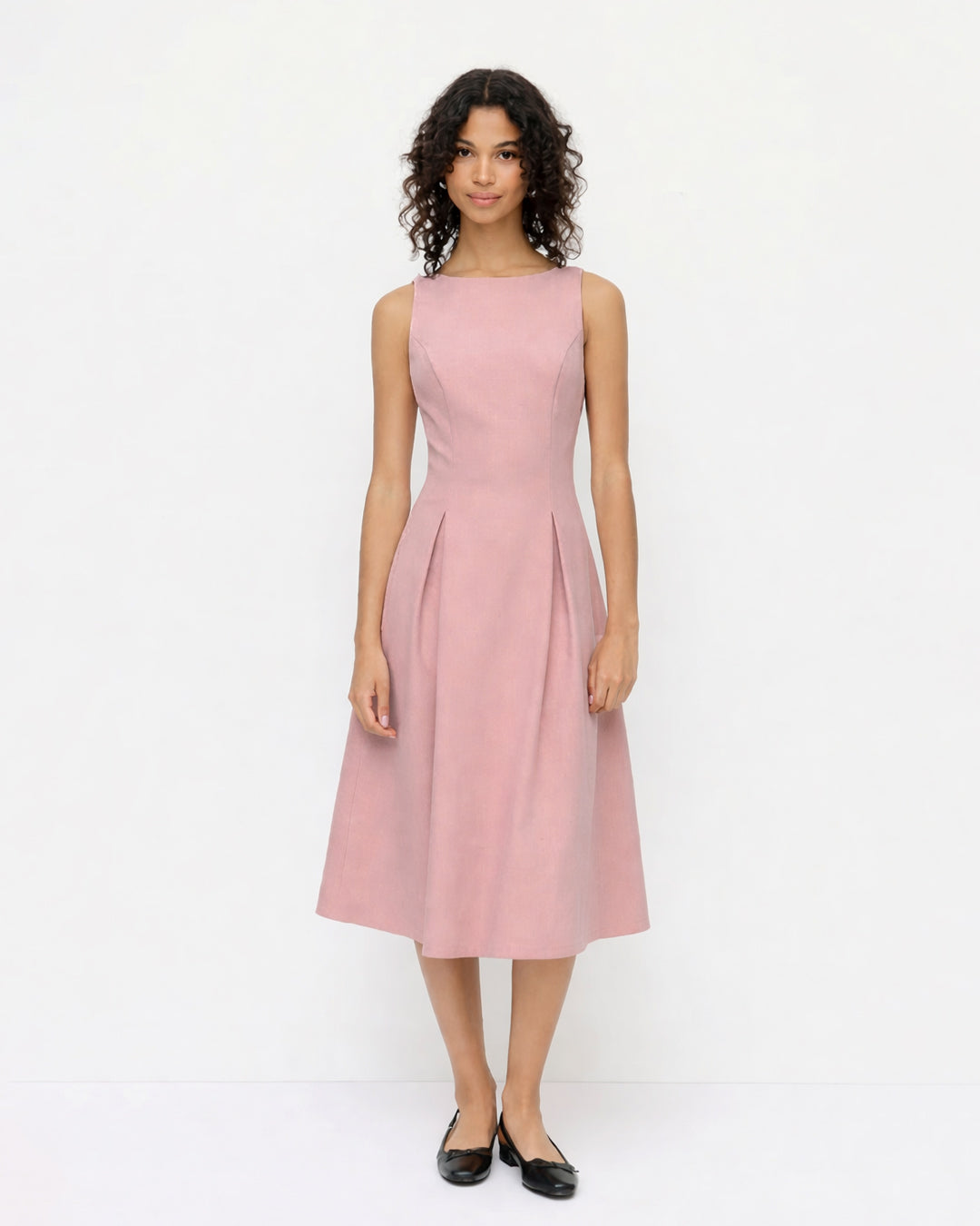 Boat Neck Pleated A-line Midi Cami Dress in Onion pink