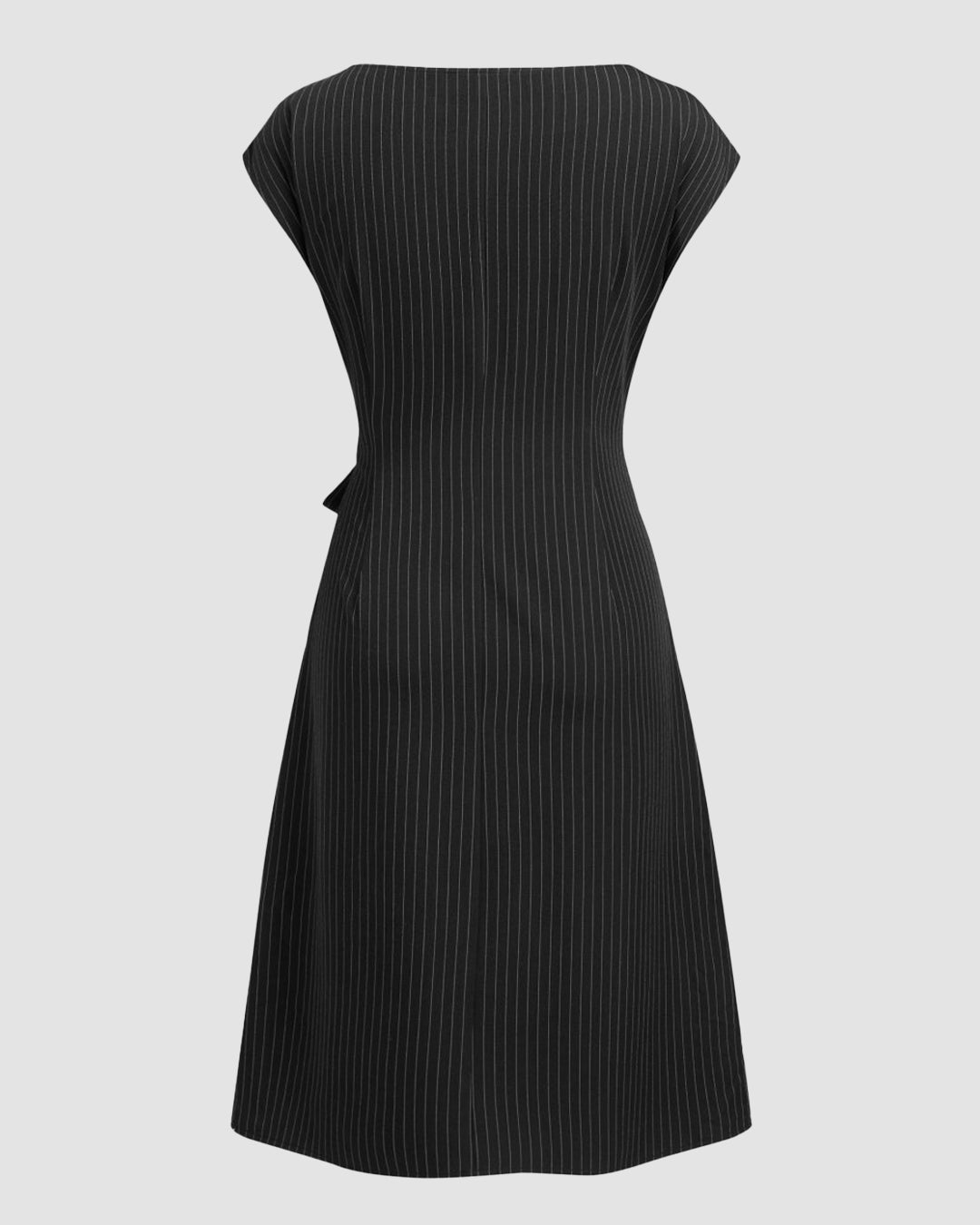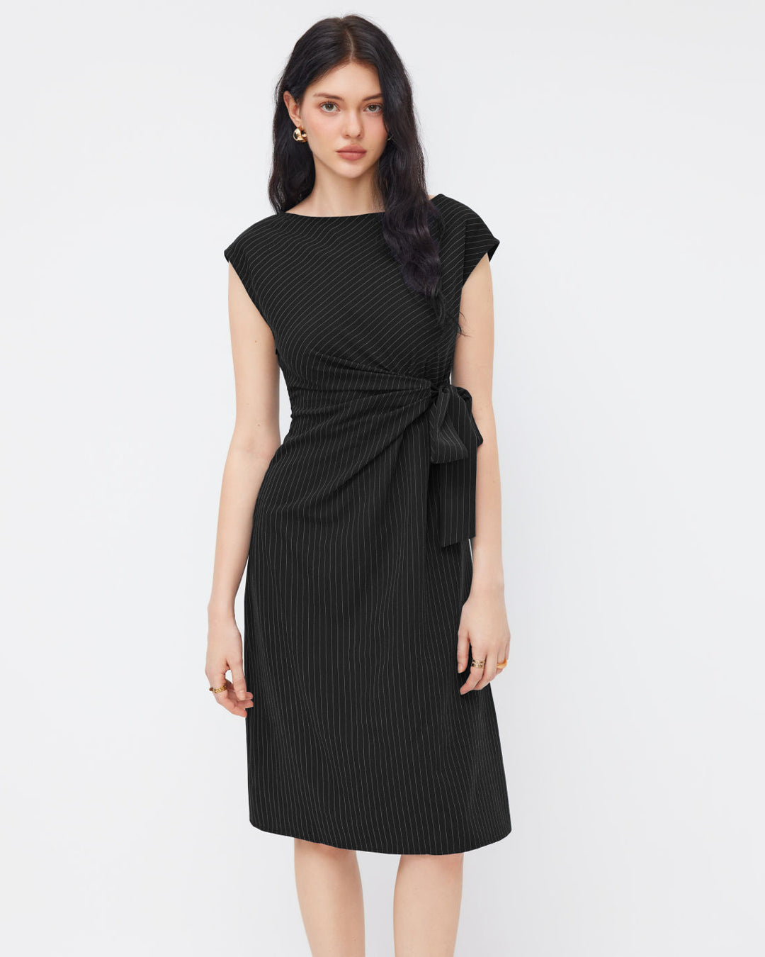 Boat Neck Stripe Knotted Ruched Midi Dress brings a clean, tailored vibe with a soft, feminine twist. Designed with a sleek boat neckline and subtle vertical stripes, this silhouette feels polished without looking stiff. The side knot detail creates gentle ruching at the waist, giving this knotted ruched midi dress a flattering shape that moves with you. The fabric feels smooth and breathable, making it easy to wear through long days. The black tone keeps it timeless, chic, and easy to style.