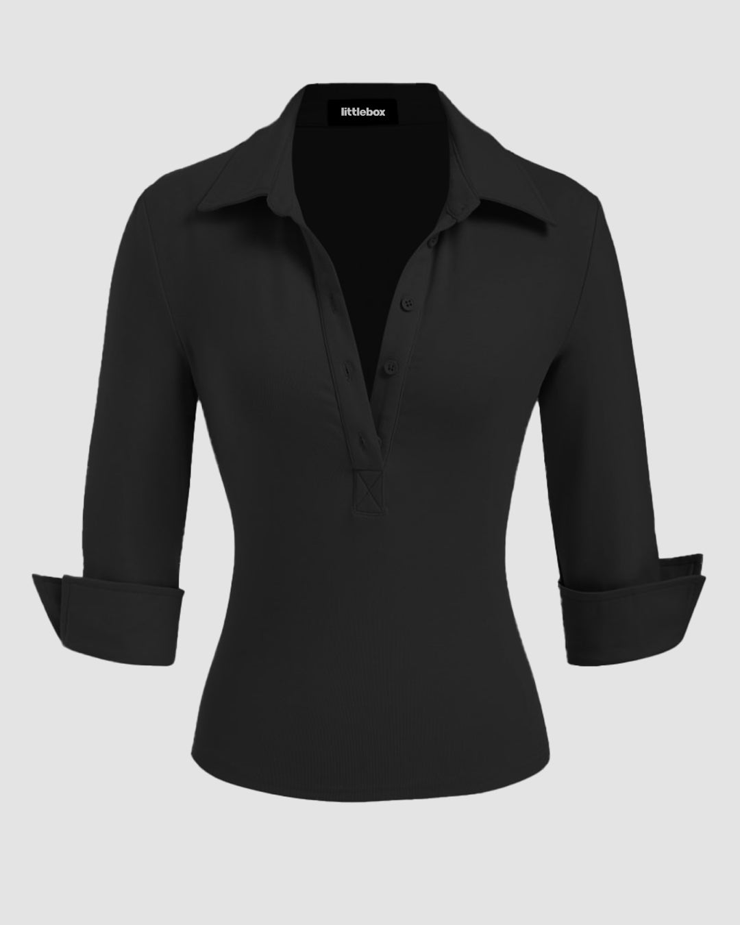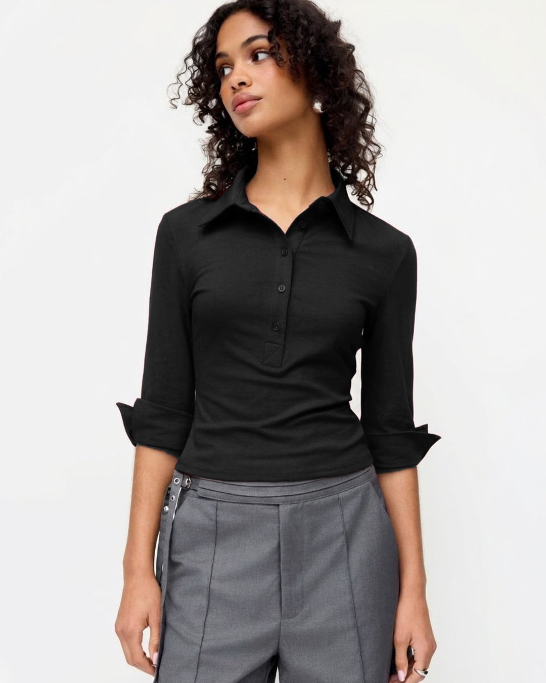 Collar Button-Front Mid Sleeve Top in Black