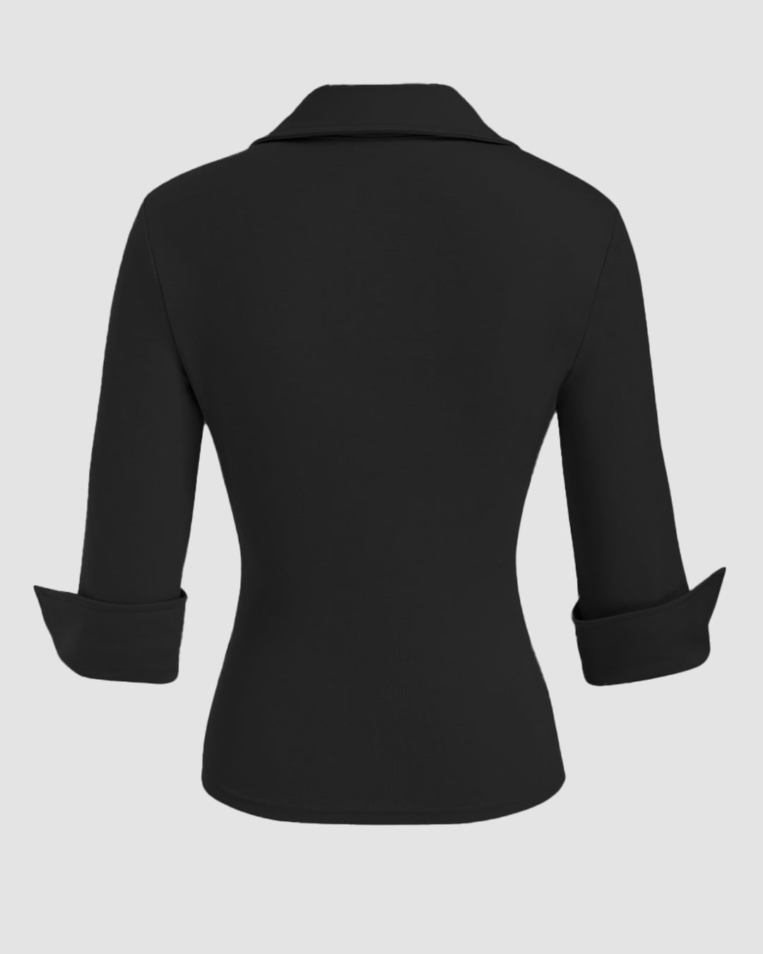 Collar Button-Front Mid Sleeve Top in Black is clean, polished, and made for effortless everyday styling. This button-front top features a classic collared neckline that adds a smart, structured touch to your look. The fitted silhouette shapes your waist naturally, while the mid sleeves keep the design balanced and comfortable. Crafted in a polyester and spandex blend, this button-front top feels smooth with a slight stretch that moves easily with you. The timeless black tone makes it versatile and easy to style with both casual and polished outfits.