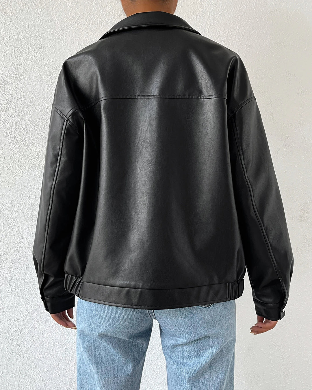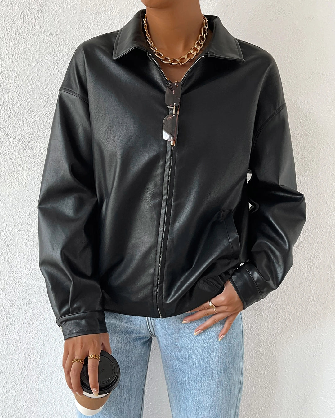 Collar Neck Solid Long Sleeve Leather Jacket in Black