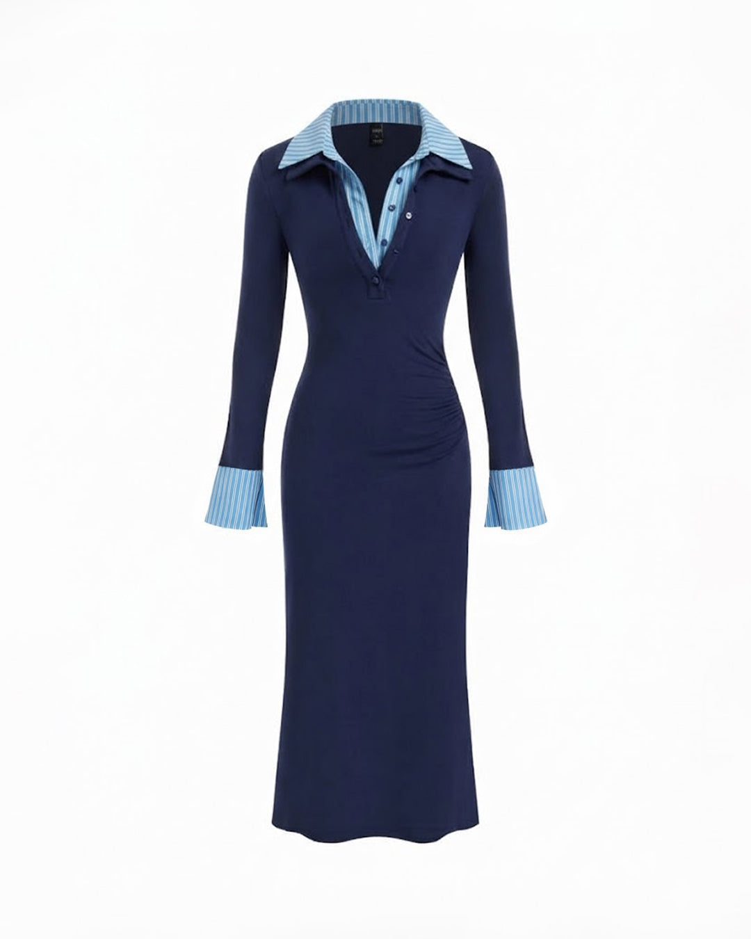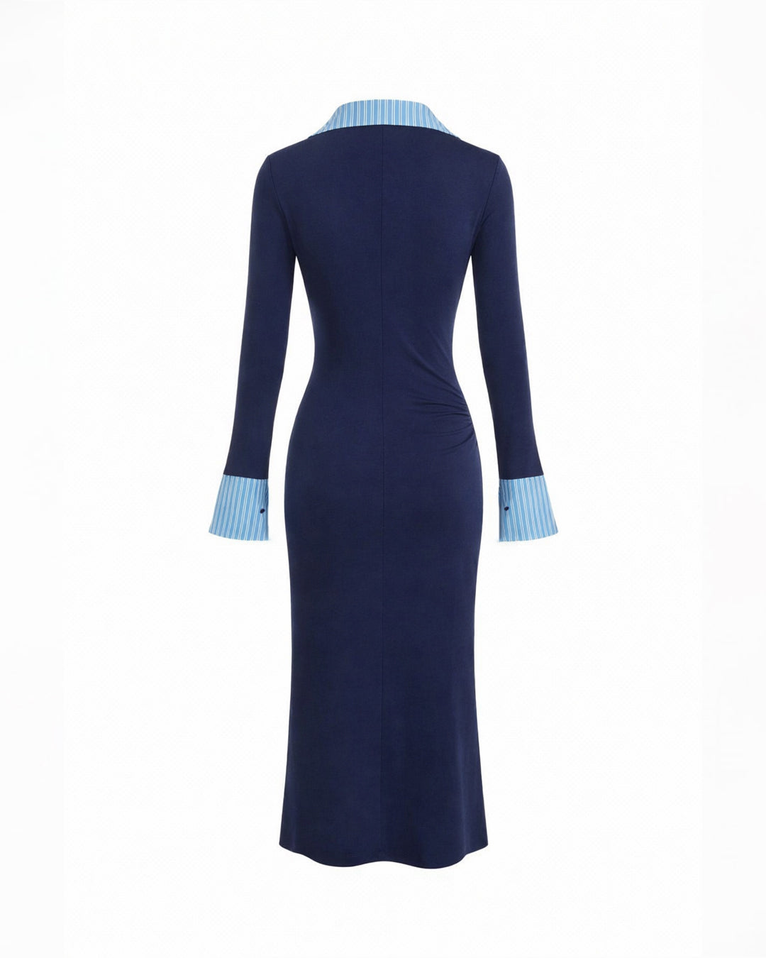 Collared Layered Flared Cuff Sleeves Ruched Dress is where smart meets stylish. This ruched dress features a sharp collared neckline with a layered detail that gives a chic, shirt-inspired vibe. The subtle ruching along the waist shapes your figure beautifully, while the flared cuff sleeves add a soft statement touch. Designed in a flattering navy blue tone, this ruched dress feels polished yet modern. The clean silhouette and structured fall make this ruched midi dress perfect for when you want effortless elegance.