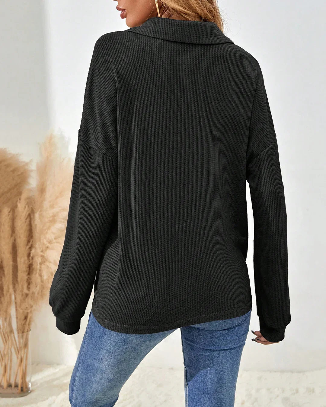 Collared Neck Straight Hem Solid Full Sleeve Top in Black
