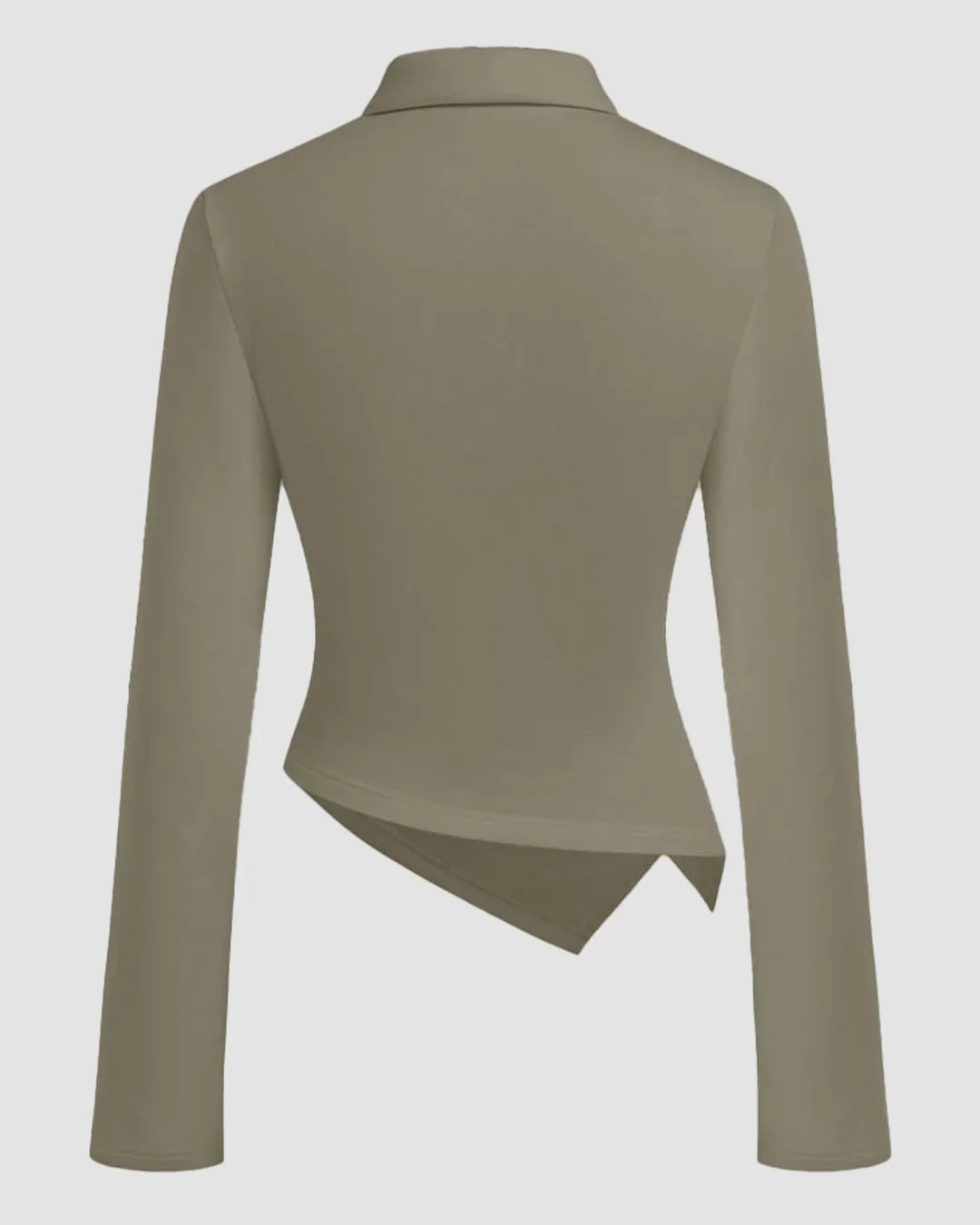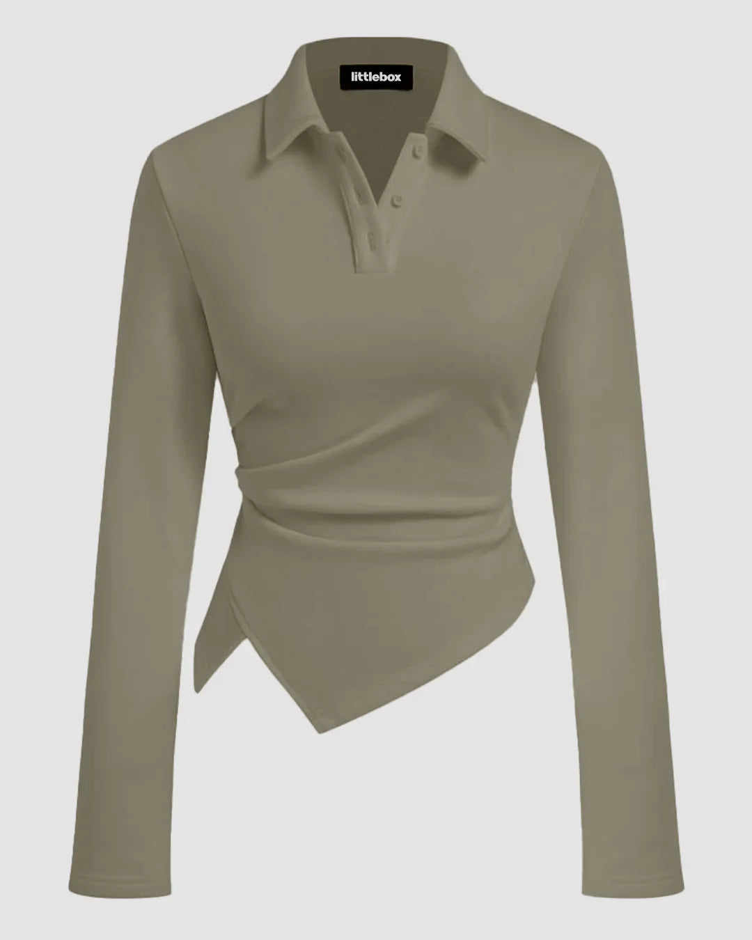 This long sleeve top is a sleek update to your everyday basics, blending structured design with soft comfort. Featuring a sharp collared neckline and button-down detail, the silhouette transitions into a ruched waist that flatters your natural shape. The asymmetric hem adds an unexpected twist, giving this long sleeve top a statement edge while staying wearable.