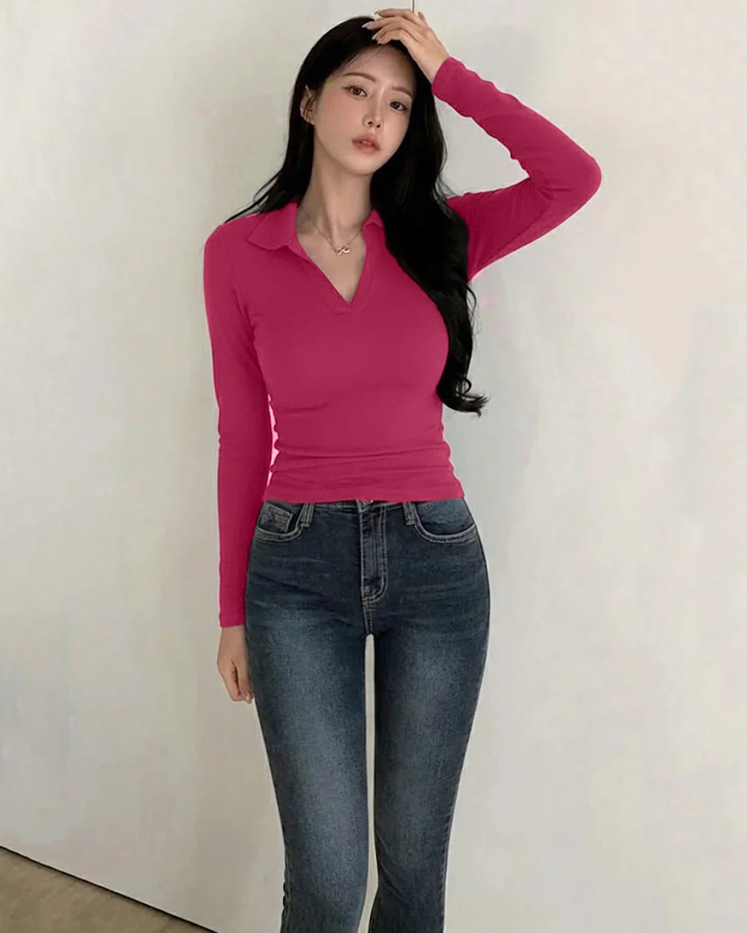 Collared V-Neck Slim Fit Solid Full Sleeve Crop Top brings a clean, polished vibe with a modern cropped twist. Designed with a sharp collar and flattering V-neck, this top sits close to the body for a sleek, confident fit. The soft, stretch-infused fabric feels smooth on the skin and moves easily with you. Full sleeves balance the cropped length perfectly, making it look put-together without feeling overdone. The solid finish keeps it versatile and easy to style across moods and seasons.